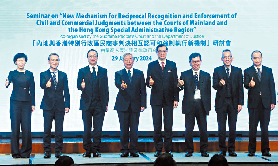 最高人民法院昨日與律政司合辦「內地與香港特別行政區民商事判決相互認可和強制執行新機制」研討會,講解有關條例及安排。最高人民法院副院長楊萬明致開幕辭,香港高等法院首席法官潘兆初、最高人民法院研究室副主任司豔麗作主旨發言。