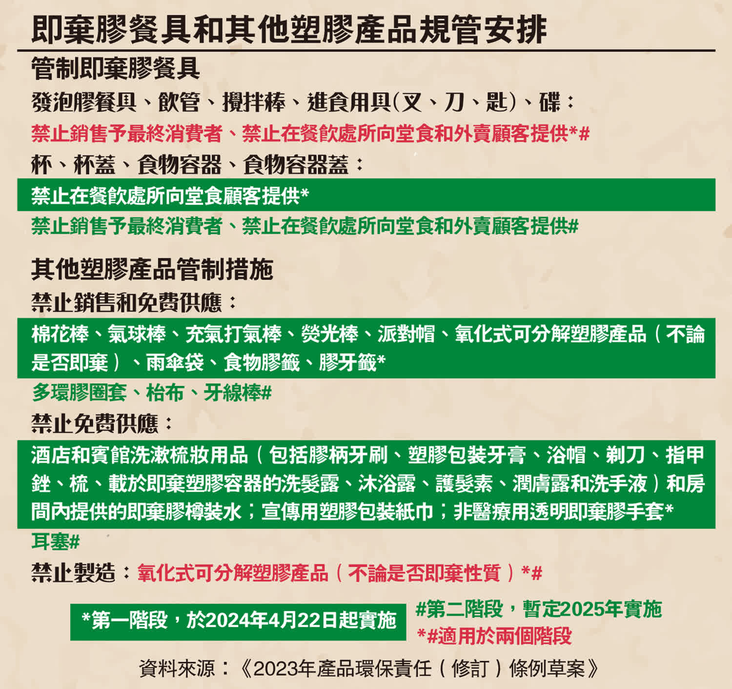 環境保護署2021年就源頭減少使用即棄膠餐具展開公眾諮詢,提出分兩階段管制即棄膠餐具及其他即棄塑膠產品。相關條例草案在2023年10月18日獲立法會三讀通過,政府隨即建議2024年4月22日實施首階段安排,並暫定2025年實施次階段。