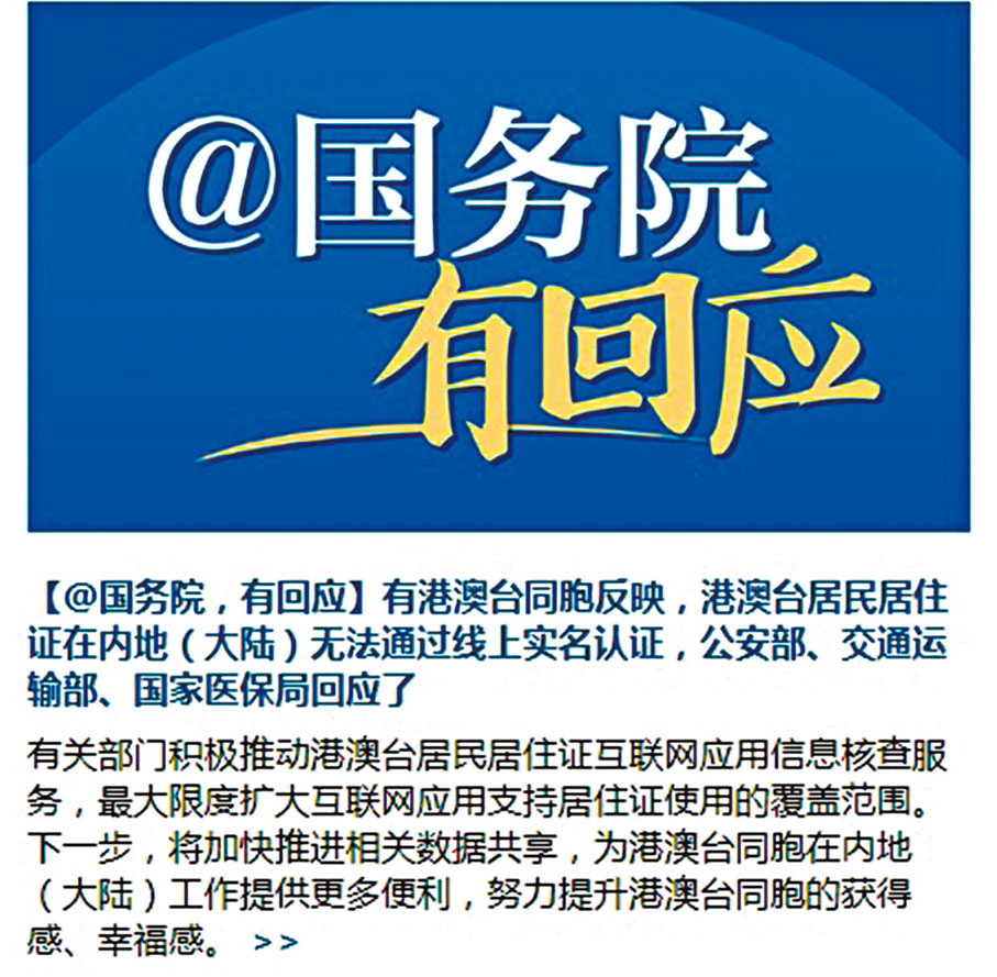 香港文匯報據中國政府網報道,2018年8月6日,國務院辦公廳印發《港澳台居民居住證申領發放辦法》,並於9月1日正式實施。五年多來,內地不斷豐富和擴大港澳台居民居住證的適用場景。不過在生活學習過程中,仍有未能覆蓋的範圍。中國政府網29日整理公布港澳台居民在該網站留言詢問,自己持有的港澳台居民居住證在內地(大陸)無法通過線上實名認證,給求職上崗、就醫診療等帶來較大影響,並披露公安部、交通運輸部和國家醫保局的詳細跟進回應。