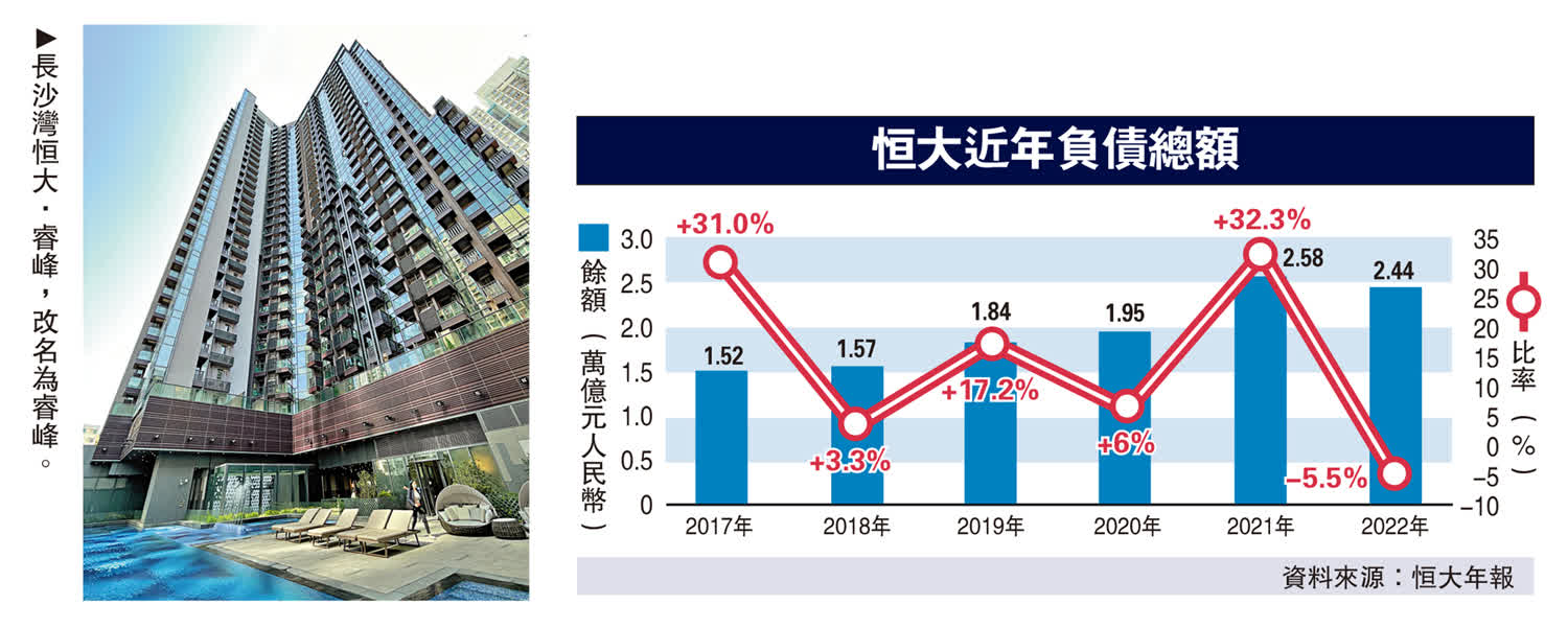 此外,恒大另一個項目、長沙灣的恆大·睿峰,全盤414個單位,貨尾已由合作夥伴鼎珮接手,改名為睿峰,目前尚餘約60伙貨尾,總銷售金額約33億元。