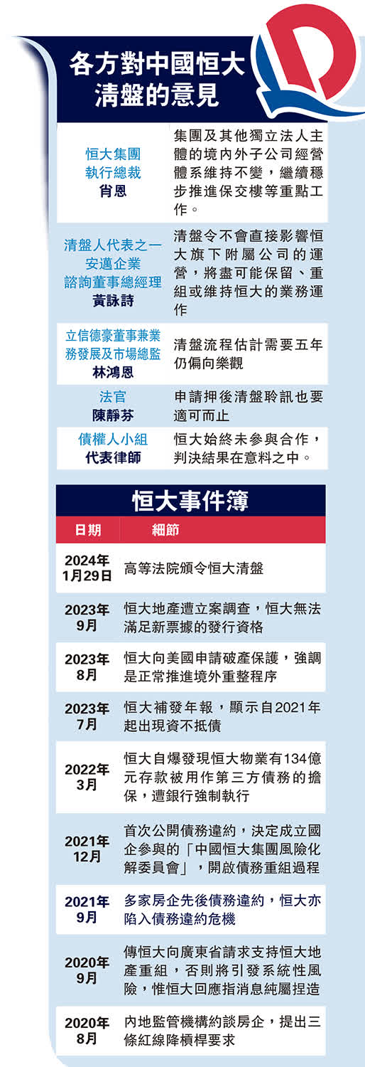 法院委任的清盤人表示,盡可能維持業務營運及公司價值,下一步將考慮任何可行重組方案。法律專家分析,若清盤官無法取得內地法院認可,則難以執行恒大境內資產。