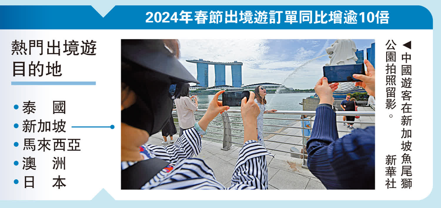 自2月9日(農曆除夕)起,中國公民可免簽入境新加坡旅行。飛豬數據顯示,免簽新政策宣布後1小時,新加坡機票搜索量環比增長超15倍、酒店搜索量環比增長超6倍。此外,攜程2024春節中國遊客赴新加坡旅遊訂單量同比增長超14倍;飛豬平台上,春節假期新加坡旅遊預訂量同比去年勁增超30倍,且有進一步加速增長趨勢。