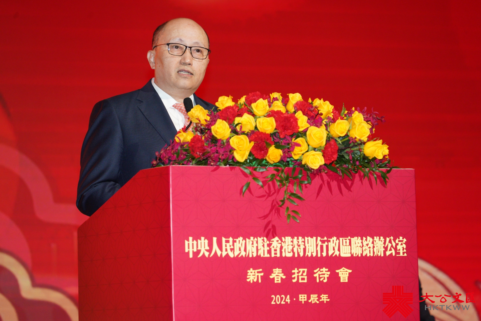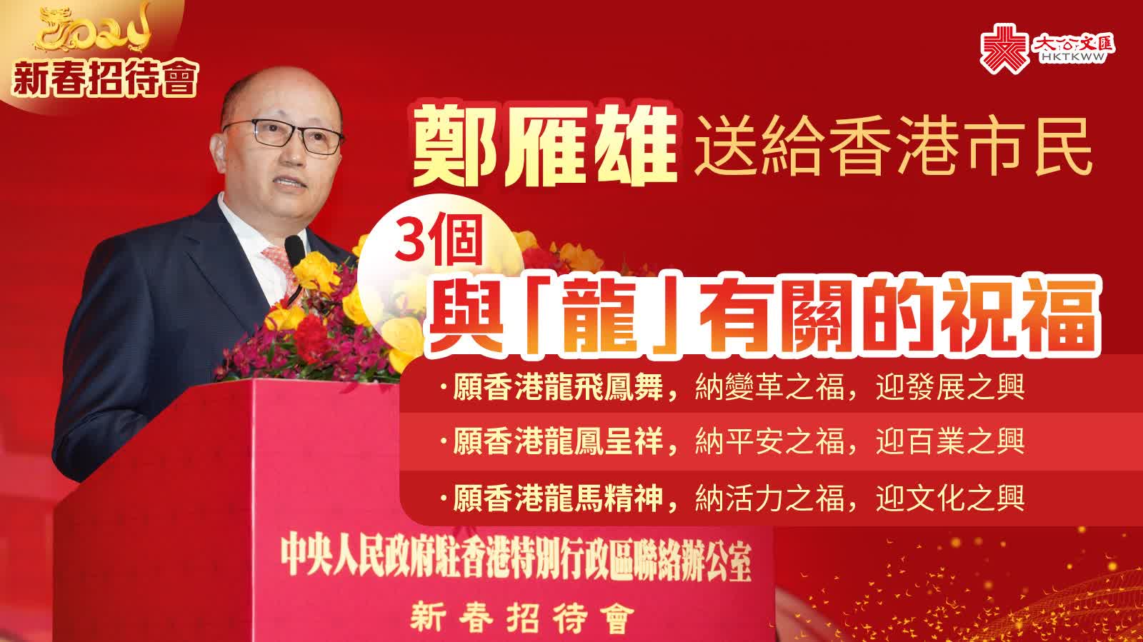大公文匯全媒體報道,中央政府駐港聯絡辦2024年新春招待會今日(30日)下午在香港會議展覽中心隆重舉行。中央政府駐港聯絡辦主任鄭雁雄在發表新春致辭時表示,正當香港駕馭世界變局、開創特區新局的重要時刻,我們共同迎來了新的龍年。龍,是中華民族的精神圖騰,龍年歷來被賦予各種美好願景。今天,當我們迎來又一個龍年,心中自然而然充滿自信和期盼,堅信龍年的到來一定會為龍的傳人帶來吉祥,為唱響《龍的傳人》的香港加持由治及興的力量。鄭雁雄指出,在這裏,有三個與「龍」有關的祝福要送給香港和廣大香港市民。