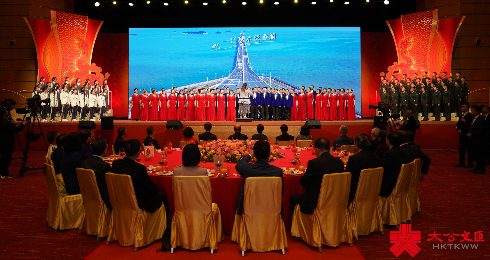 培僑中學學生、杭州亞運健兒代表,與中央政府駐港聯絡辦、駐港國家安全公署、外交部駐港特派員公署、解放軍駐港部隊等中央駐港機構的員工代表,共同帶來合唱《灣區是故鄉》。「香山香洲通香港,灣區處處香;清風故人不期至,灣區是故鄉。」優美的旋律與歌詞,打動人心,引得陣陣掌聲。
