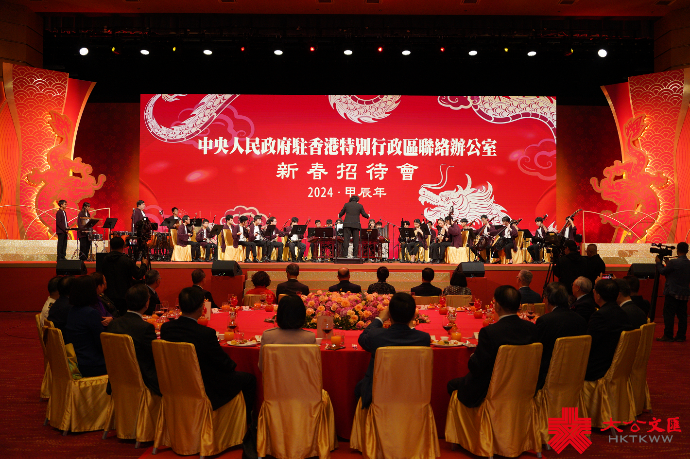 大公文匯全媒體報道,中央政府駐港聯絡辦2024年新春招待會今晚(30日)在香港會議展覽中心隆重舉行。中央政府駐港聯絡辦主任鄭雁雄、香港特區行政長官李家超發表致辭,全國政協副主席梁振英等嘉賓出席。