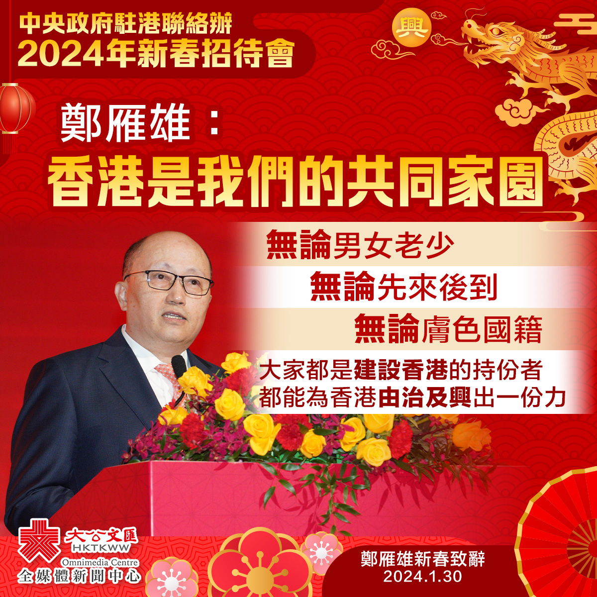 鄭雁雄表示,新的一年,駐港聯絡辦將肩負中央重託,深入落實習近平主席重要指示要求,繼續當好「超級聯絡員」,全面準確、堅定不移貫徹「一國兩制」方針,全力支持李家超行政長官和特區政府依法施政,全面聯繫社會各界,全情服務香港市民,全程助推香港由治及興,為香港「一國兩制」事業行穩致遠竭盡所能、貢獻所有。