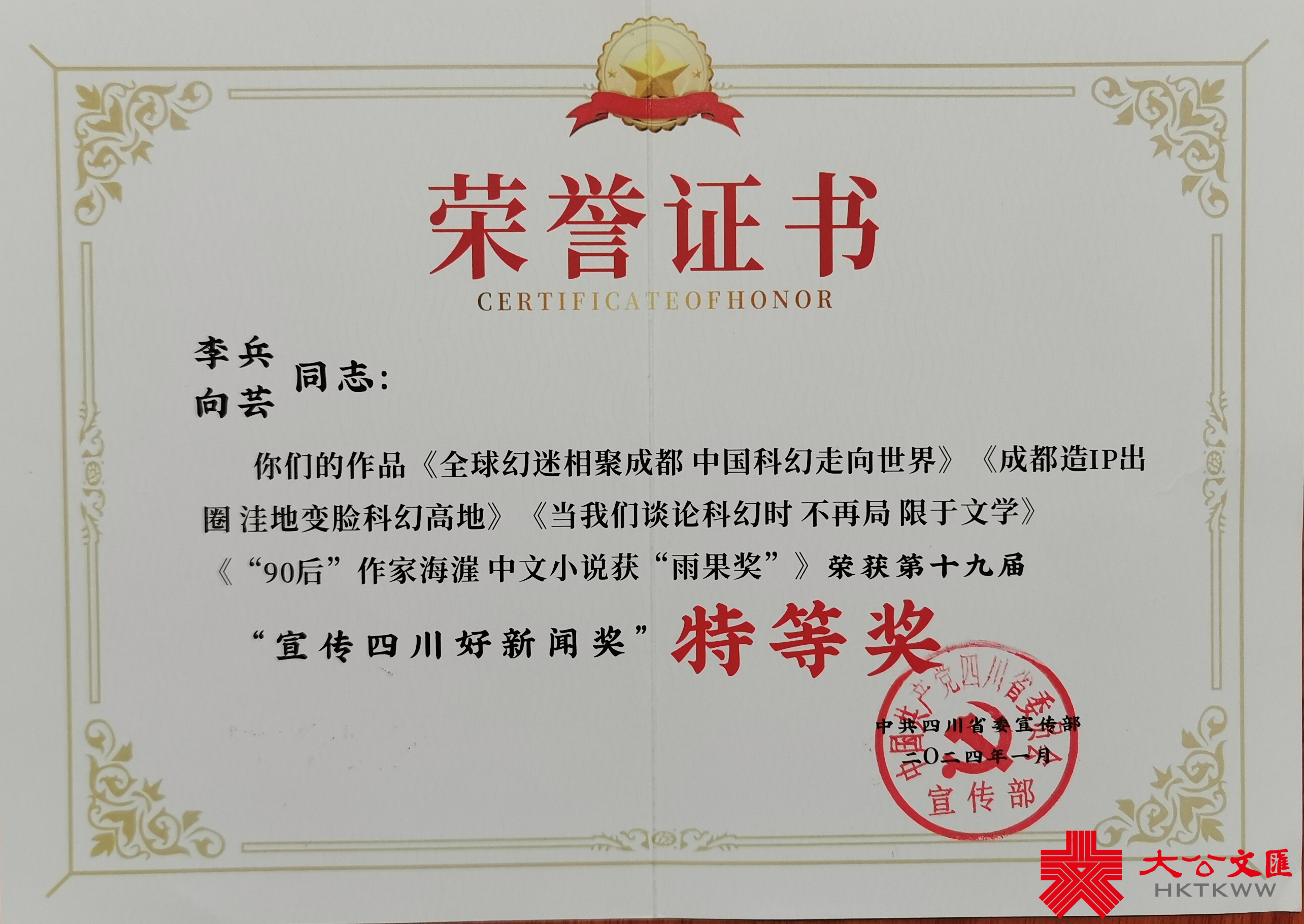 (大公文匯網記者 李兵 成都報道)1月30日,香港大公文匯傳媒集團駐川記者收到來自四川省委宣傳部寄來的「宣傳四川好新聞獎」獎狀。在第十九屆「宣傳四川好新聞獎」評獎活動中,由該集團推薦的兩件作品分別獲得特等獎、二等獎。