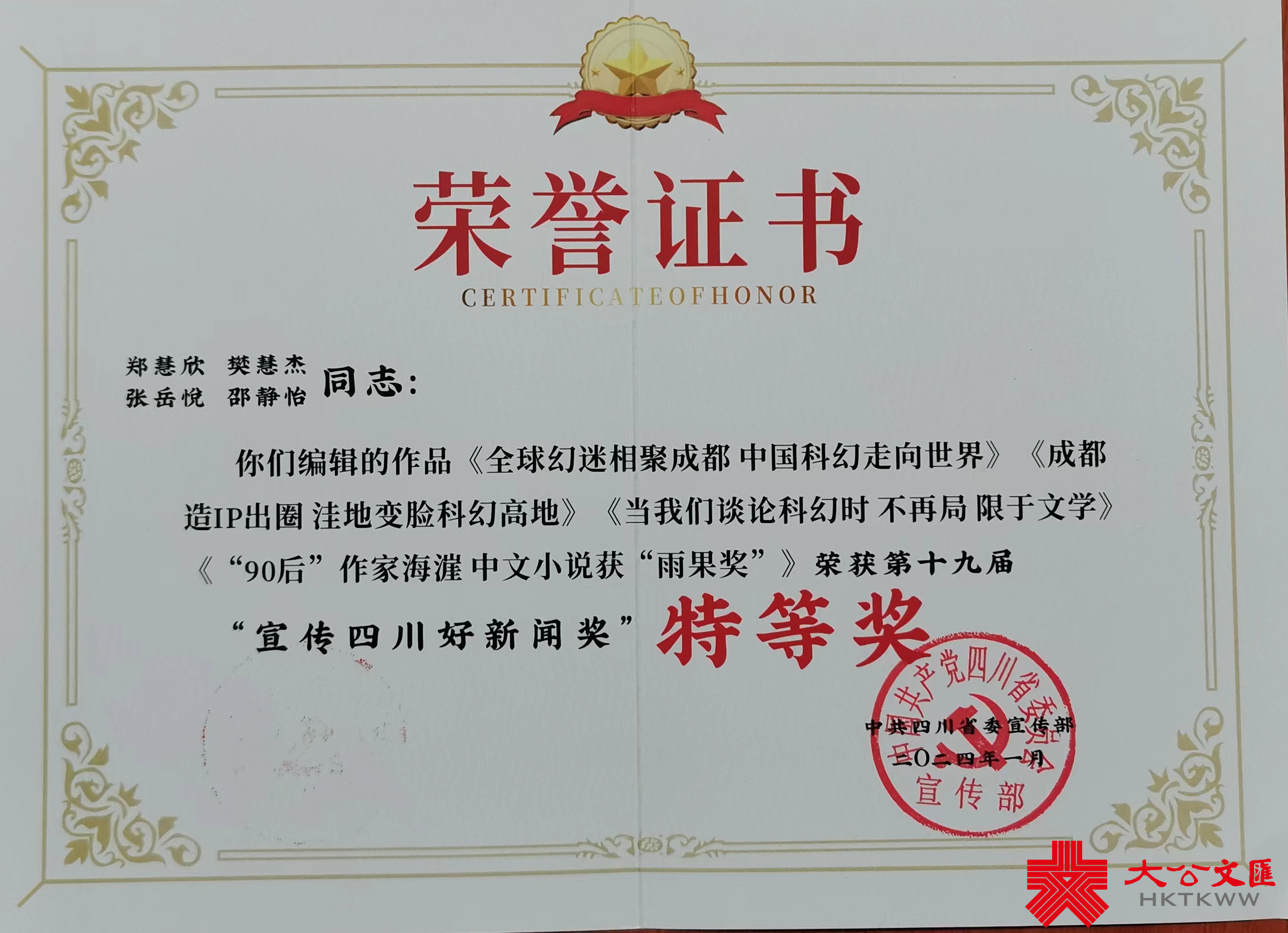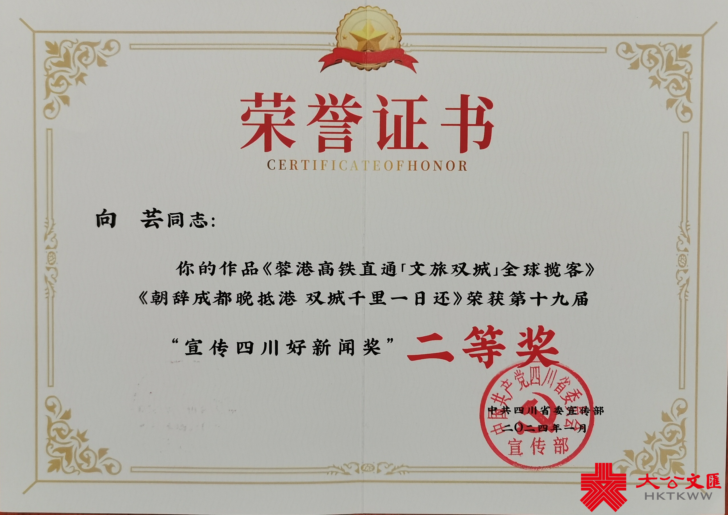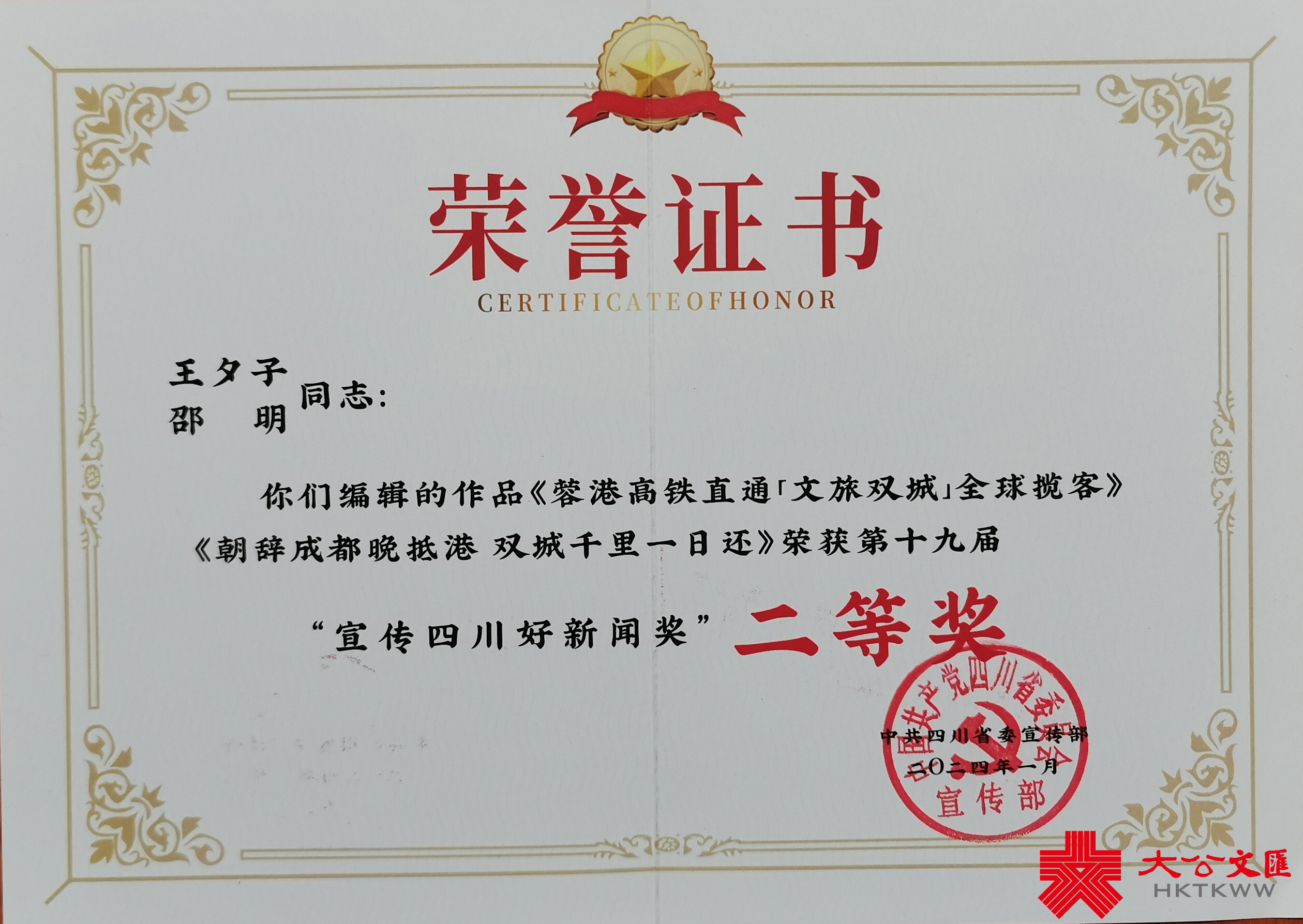 據悉,在第十八屆「宣傳四川好新聞獎」評獎活動中,由香港大公文匯傳媒集團推薦的《川港高層會晤系列報道》榮獲一等獎,《千年國寶展現巴蜀文脈》獲二等獎,《汶川地震十周年系列報道》獲三等獎。