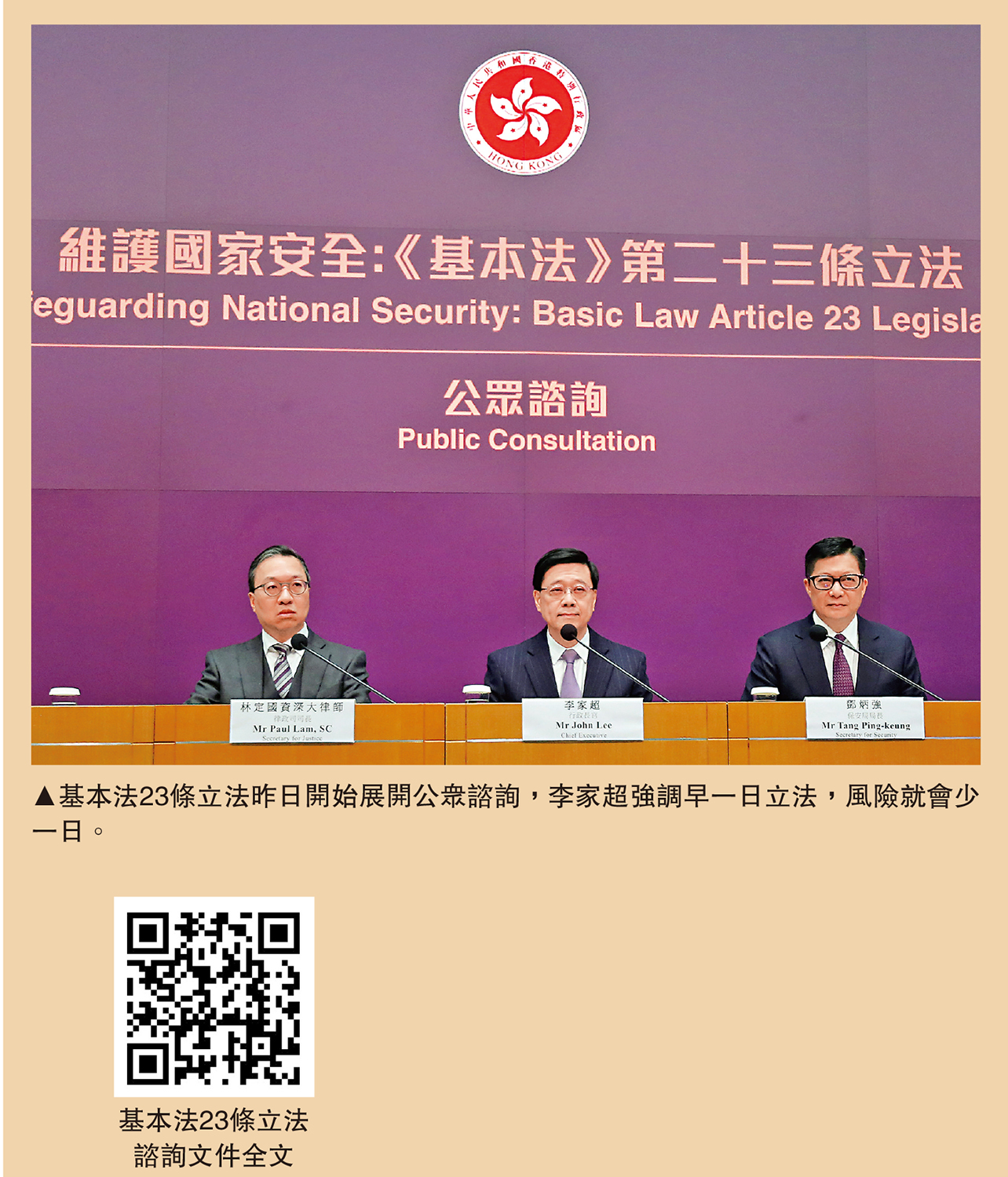 李家超昨日在特區政府總部主持「維護國家安全:基本法第二十三條立法公眾諮詢」記者會。他表示,此次立法建議採取三個原則:第一,「一國兩制」方針的最高原則是維護國家主權、安全、發展利益;第二,尊重和保障人權,依法保護根據香港基本法、《公民權利和政治權利國際公約》和《經濟、社會與文化權利的國際公約》適用於香港特區的有關規定享有的包括言論、新聞、出版、結社、集會、遊行、示威的自由在內的權利和自由;第三,對於危害國家安全的行為和活動應當按法治原則堅持積極預防和依法懲治。