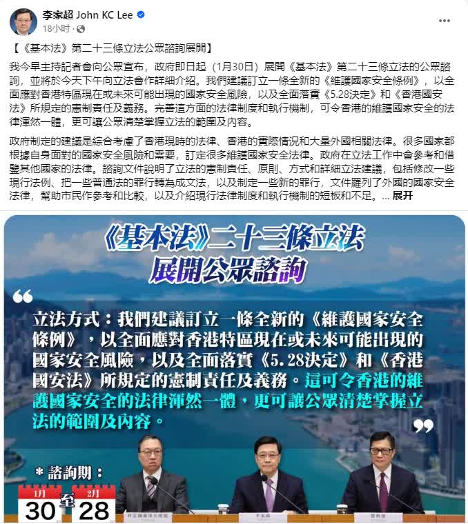 李家超其後在社交媒體發貼表示,特區政府制定的建議是綜合考慮了香港現時的法律、香港的實際情況和大量外國相關法律。諮詢文件說明了立法的憲制責任、原則、方式和詳細立法建議,包括修改一些現行法例、把一些普通法的罪行轉為成文法,以及制定一些新的罪行,文件羅列了外國的國家安全法律,幫助市民作參考和比較,以及介紹現行法律制度和執行機制的短板和不足。諮詢文件在保安局的網頁公布,亦於指定地點派發,歡迎市民在1月30日至2月28日的諮詢期內提供意見。