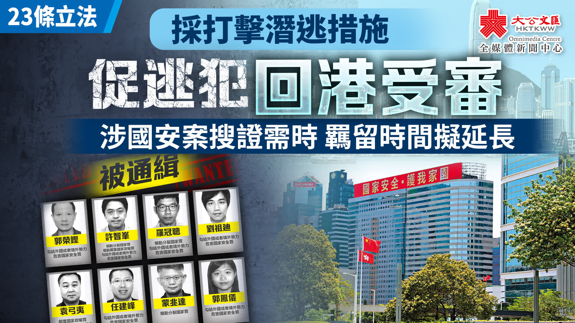 在疑犯潛逃海外的情況方面,特區政府在諮詢文件提到,法院於2023年應警務處國家安全處的申請,就共13名潛逃海外並涉嫌干犯香港國安法罪行的人發出拘捕令。該13名潛逃者潛逃海外後,涉嫌繼續進行一些危害國家安全的行為和活動,包括要求外國所謂「制裁」香港特區的官員和法官、煽動分裂國家及顛覆國家政權等。