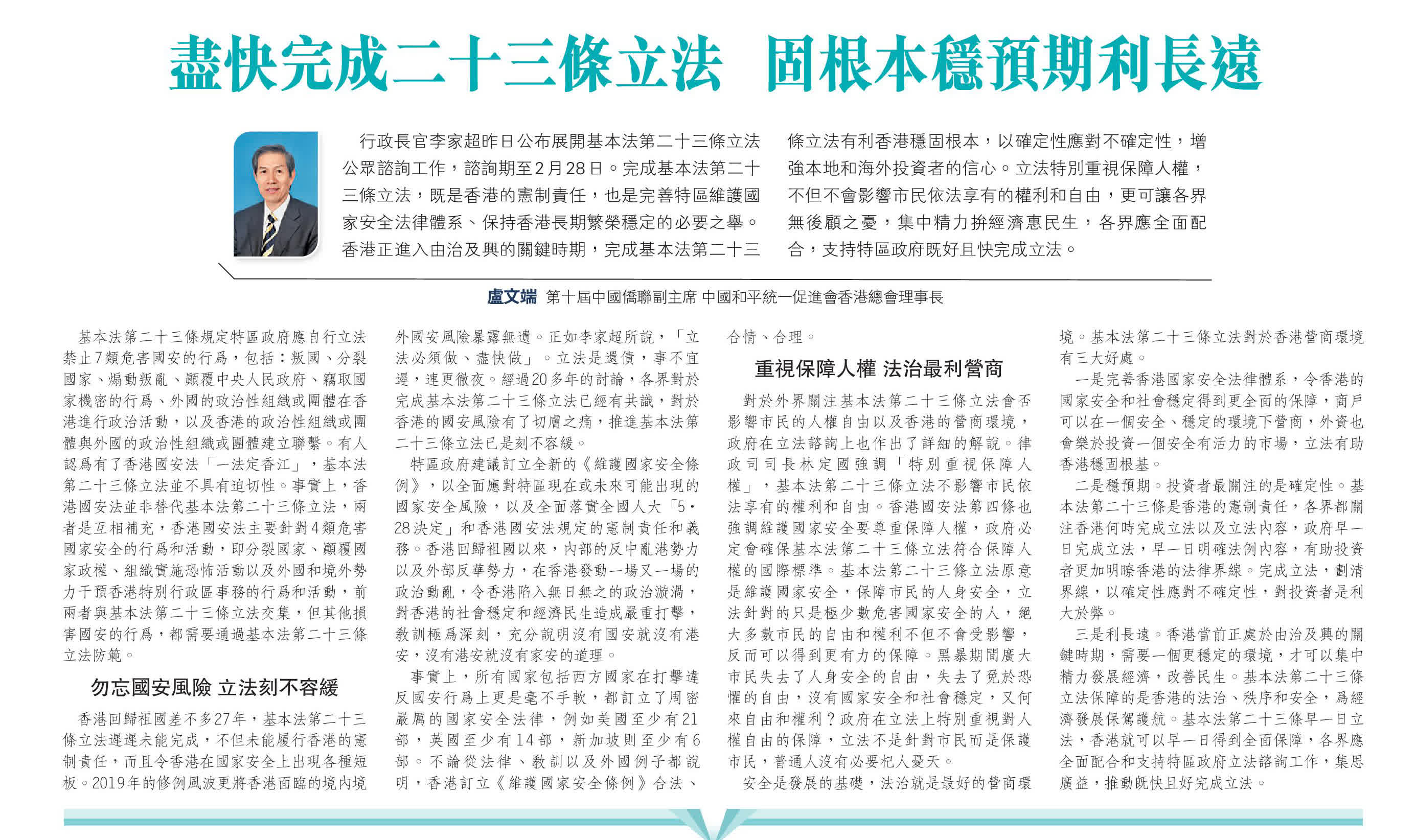 三是利長遠。香港當前正處於由治及興的關鍵時期,需要一個更穩定的環境,才可以集中精力發展經濟,改善民生。基本法第二十三條立法保障的是香港的法治、秩序和安全,為經濟發展保駕護航。基本法第二十三條早一日立法,香港就可以早一日得到全面保障,各界應全面配合和支持特區政府立法諮詢工作,集思廣益,推動既快且好完成立法。
