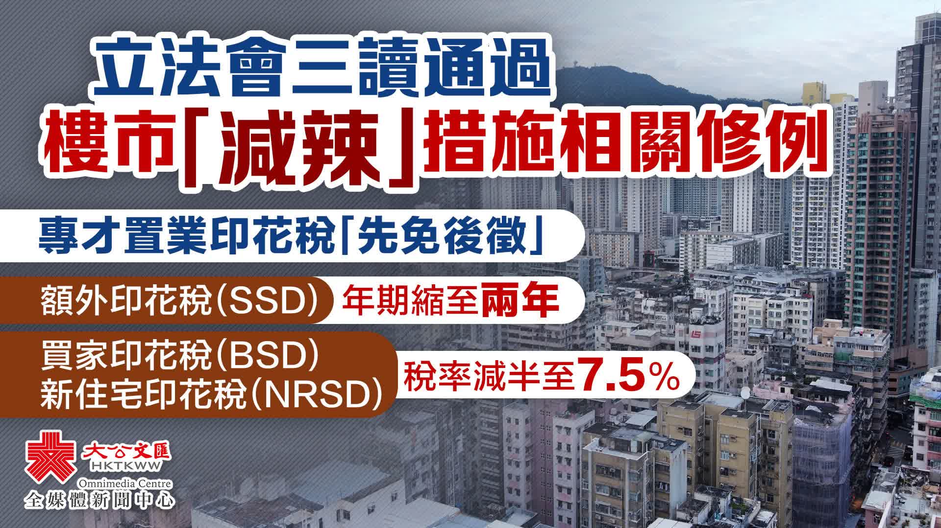 大公文匯全媒體報道,施政報告提出為樓市「減辣」,立法會今日(1月31日)舉行會議,三讀通過樓市「減辣」措施相關修例。
