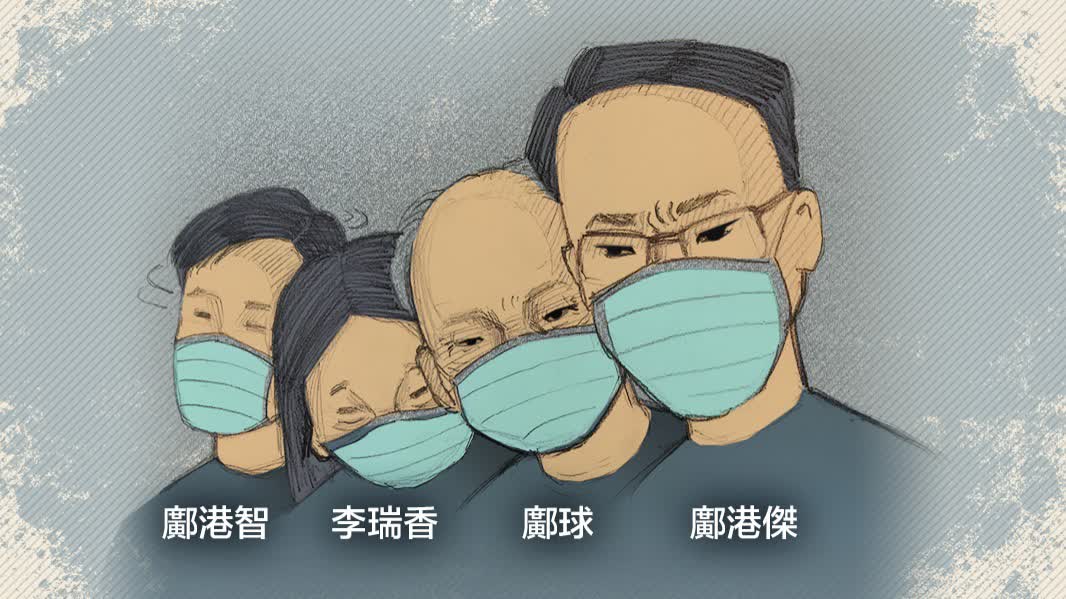 同案3名男被告:鄺港傑(司機,31歲)、鄺球(退休,65歲),及鄺港智(無業,28歲),分別為蔡天鳳的前大伯、前家翁和前夫。鄺氏3人被控謀殺及阻止合法埋葬屍體兩罪,指他們2023年2月21日於新界大埔汀角路龍尾村某單位內謀殺女子蔡天鳳;並於2月21日至23日之間,在上述龍尾村56B地下,阻止合法埋葬蔡天鳳的屍體。