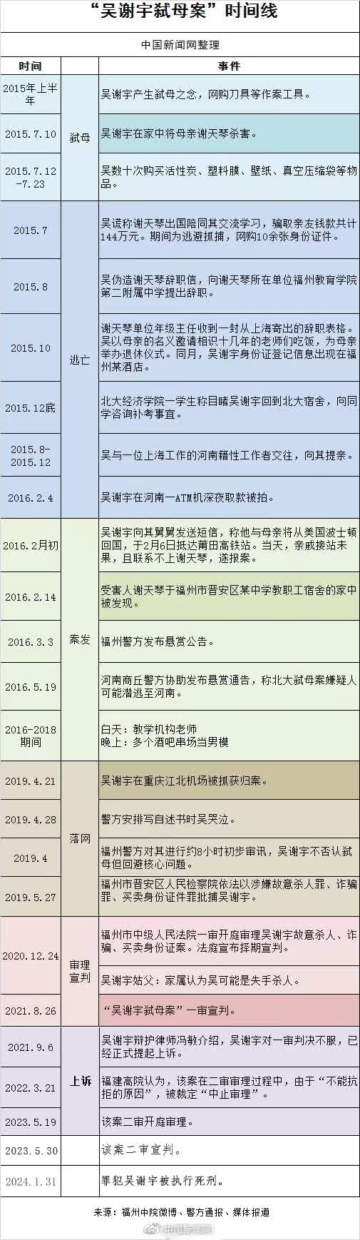 據新華社報道,2024年1月31日,福州市中級人民法院遵照最高人民法院下達的執行死刑命令,對罪犯吳謝宇執行了死刑。