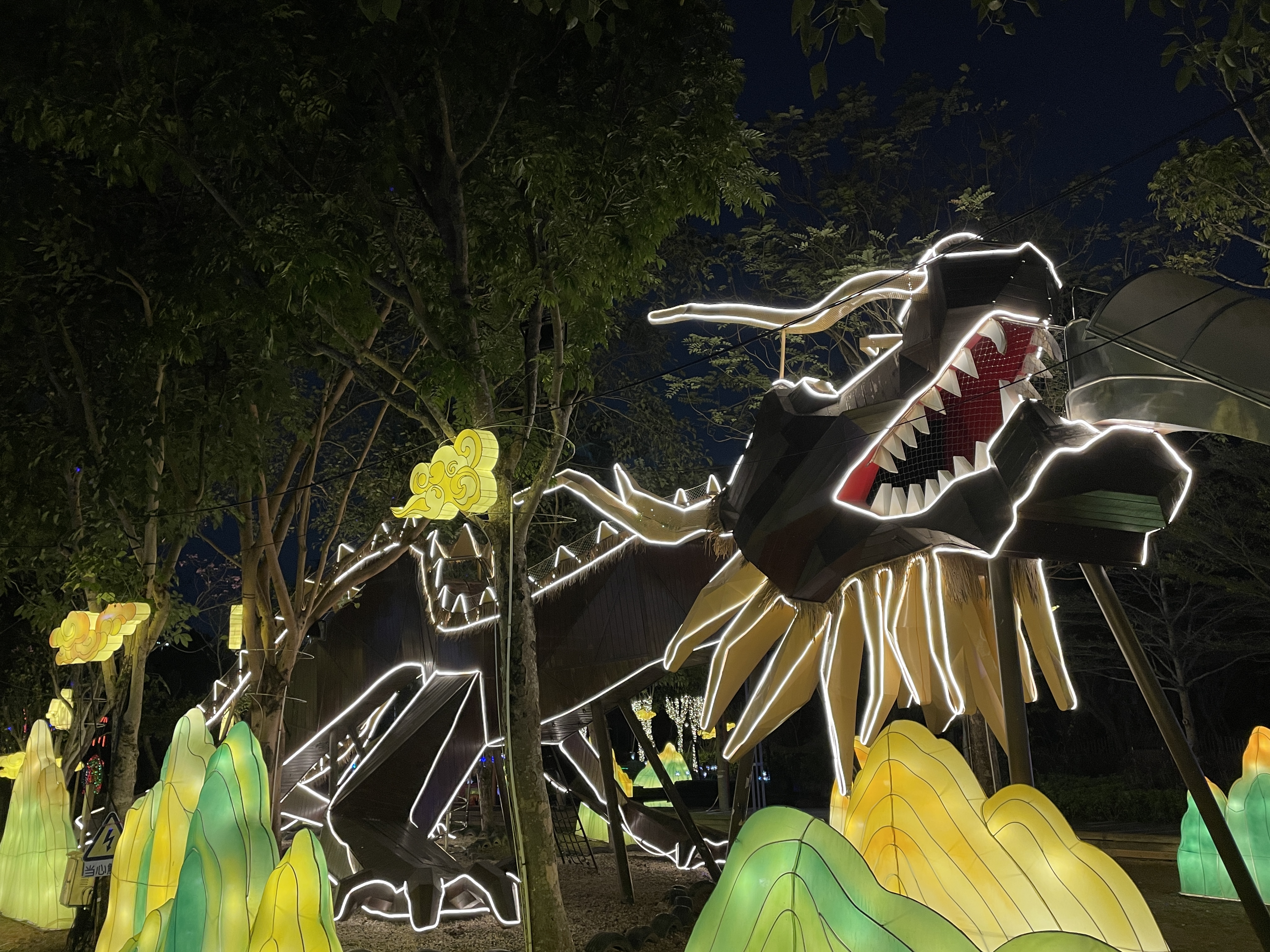 除了上新日場體驗項目,當夜幕降臨時,古鎮及農場都被流光溢彩的燈光喚醒,夜場的主題彩燈裝置再升級,圍繞客韻新年,將小涼帽農場的自然田園風光與奇幻酷炫的光影藝術相結合,打造甘坑奇幻夜2.0版本——「龍游界涇 煙火甘坑」主題燈展,新增下雪機及激光秀,以絢爛又浪漫的彩燈光影,描繪出田園野趣版的撩人景色,開啟奇幻浪漫的遊園之夜。