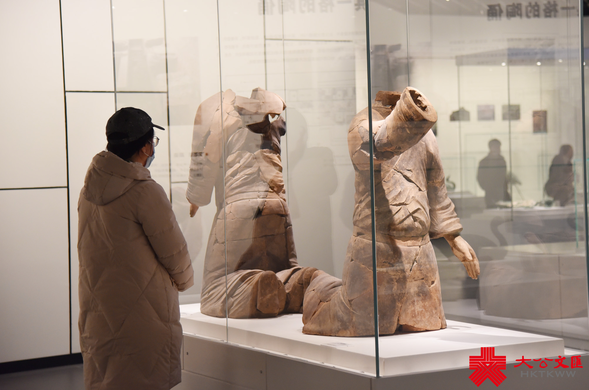 記者在現場看到,展覽展出的青銅水禽文物,涵蓋天鵝、仙鶴、鴻雁等多種動物類型,不僅形態各異、鑄造精細,同時歷經兩千餘年,依然鮮活靈動、栩栩如生。而箕踞姿陶俑,兩腿微開前伸,席地而坐,形狀像簸箕樣。跽姿陶俑則上身挺直兩膝着地,屁股微抬起,未落於腳後跟上。這兩種陶俑與眾不同的姿態和別具一格的造型,讓人眼前一亮,吸引了很多觀眾拍照留念。