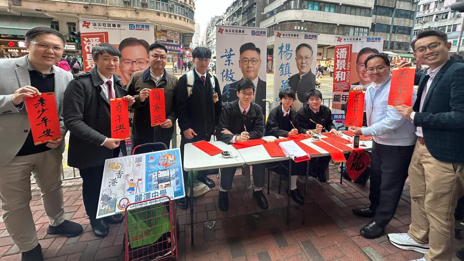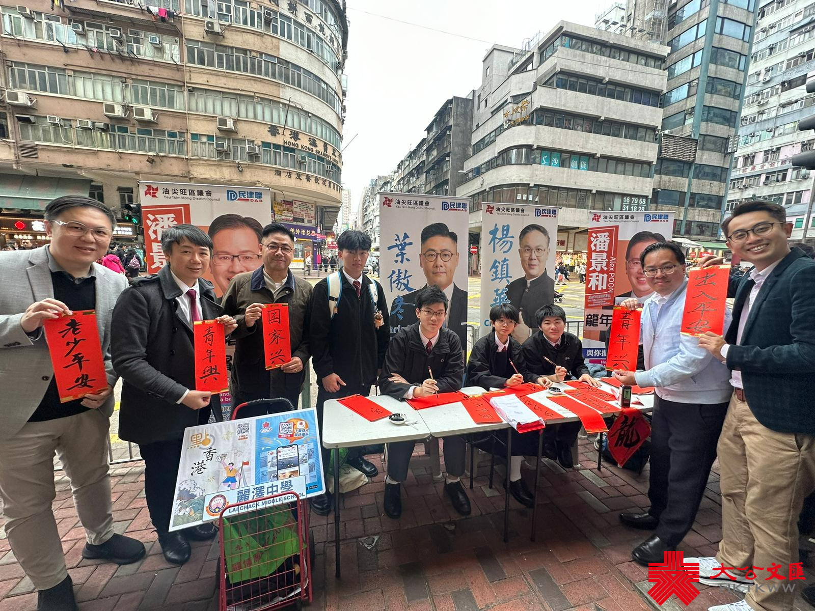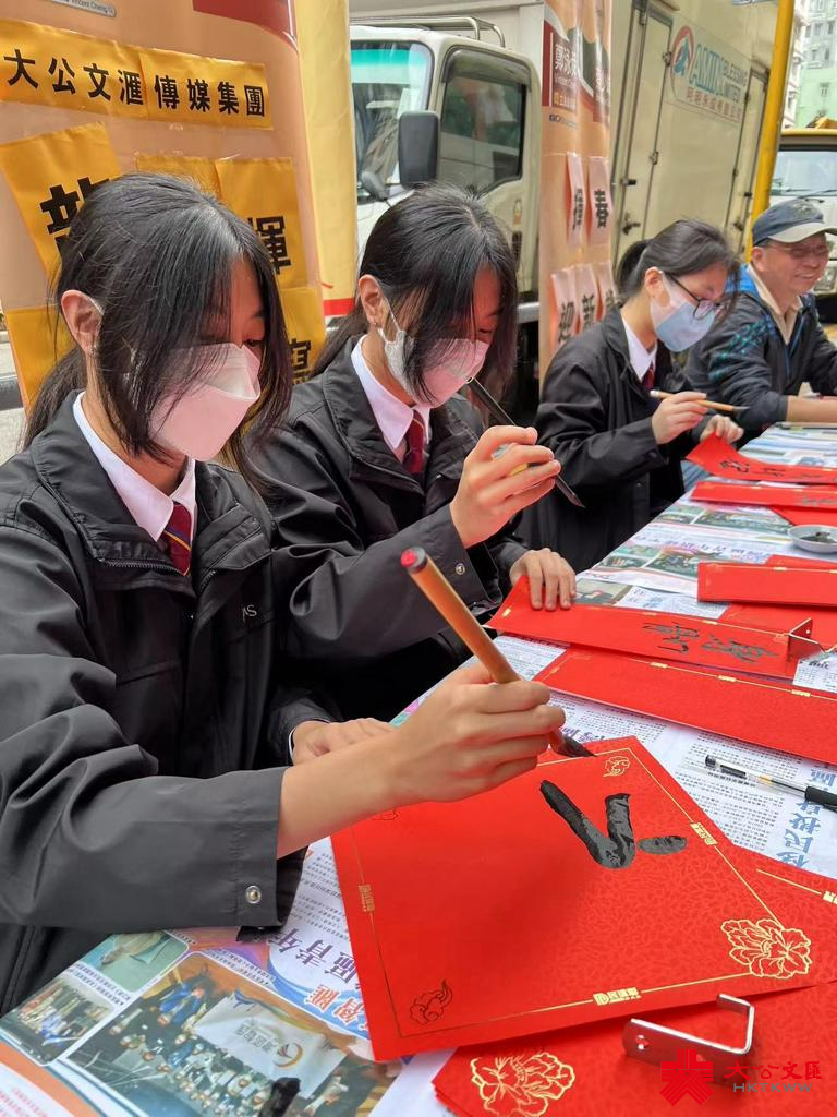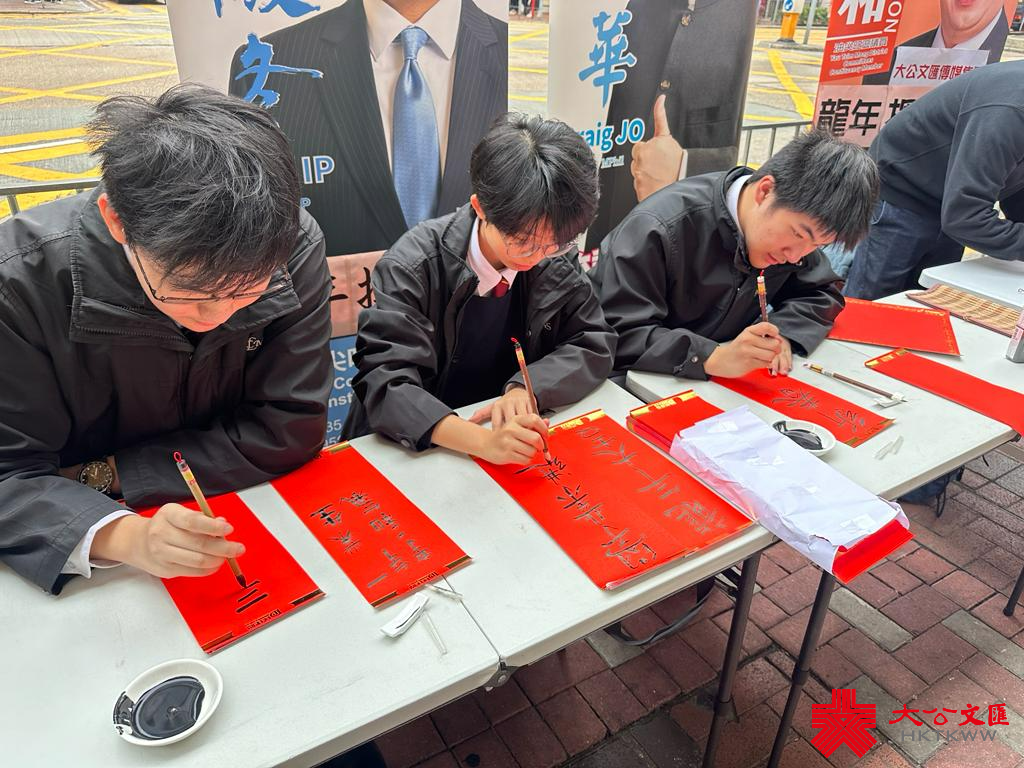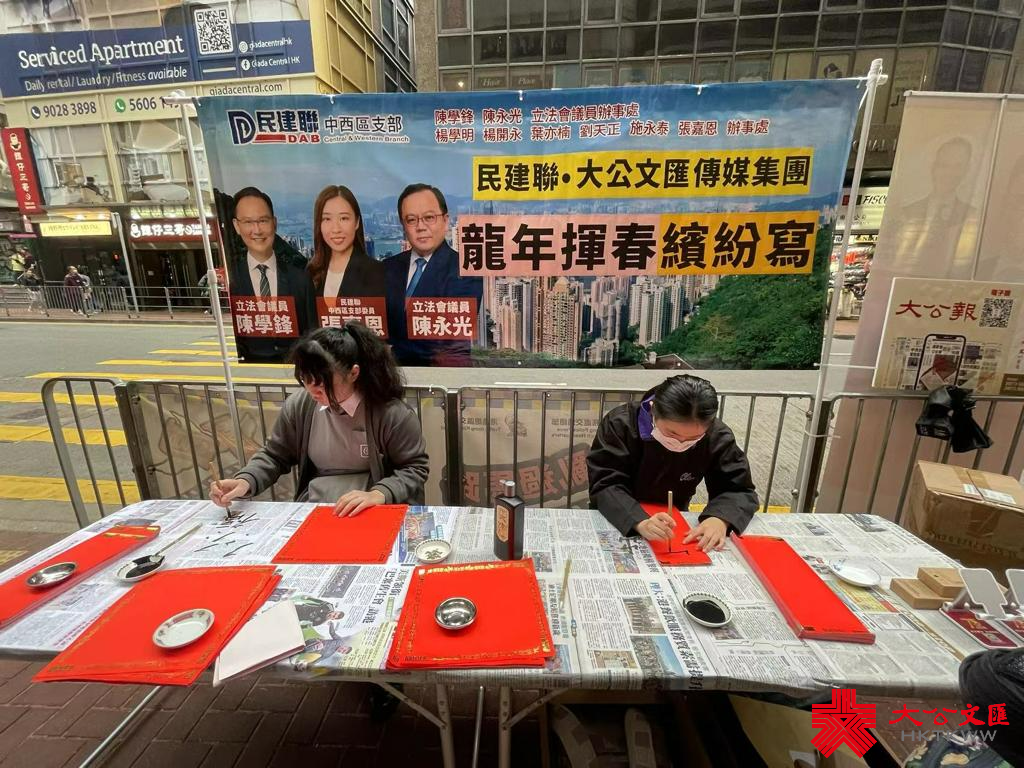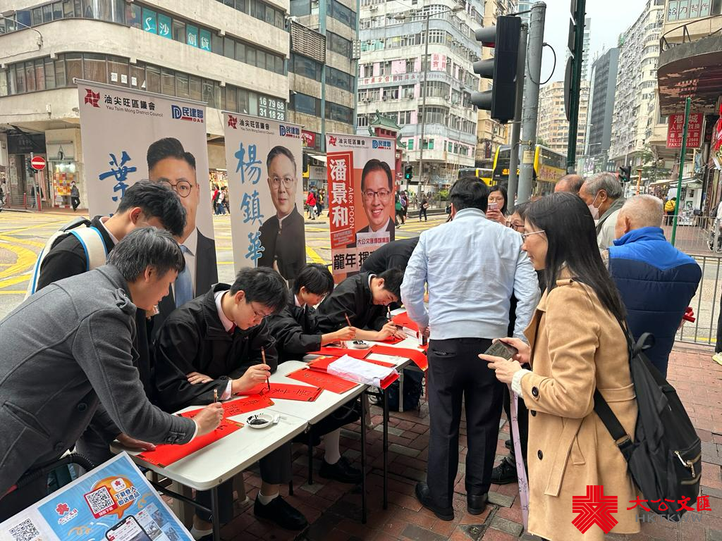 (大公文匯全媒體記者藍松山報道)農曆新年將至,香港大公文匯傳媒集團與民建聯攜手合作,舉行「龍年揮春繽紛寫」活動。該活動由香港大公文匯傳媒集團邀請「香港青少年書法大獎賽」中的得獎學生,現場為市民寫揮春,增添節日氣氛。民建聯秘書長、油尖旺區議員葉傲冬表示,春節前為市民寫揮春,是民建聯地區傳統習慣,希望將吉祥如意派給街坊。他提到,今次與香港大公文匯傳媒集團合作,由多名青年為市民即場揮毫,更具有象徵意義,因為青年是香港的未來,希望他們可以將中華傳統文化繼續傳承下去。