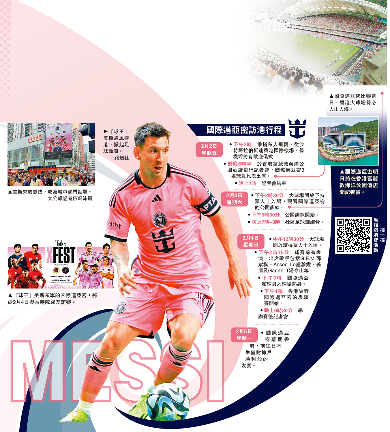 (大公報記者 伍軒沛、易曉彤、戴靜文、譚德龍)特區政府全力推動盛事經濟,「球王」美斯領軍的美職球隊國際邁亞密,將於明日抵港展開四日訪港行程,星期日(2月4日)在香港大球場與香港隊合演友誼賽。美斯這次旋風式訪港,掀起追星熱潮,亦將帶旺周邊消費市道。