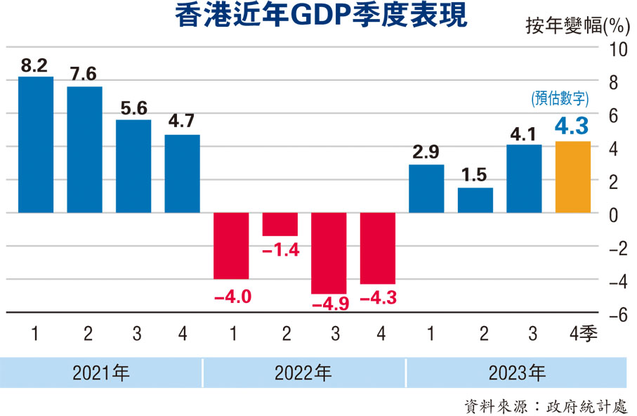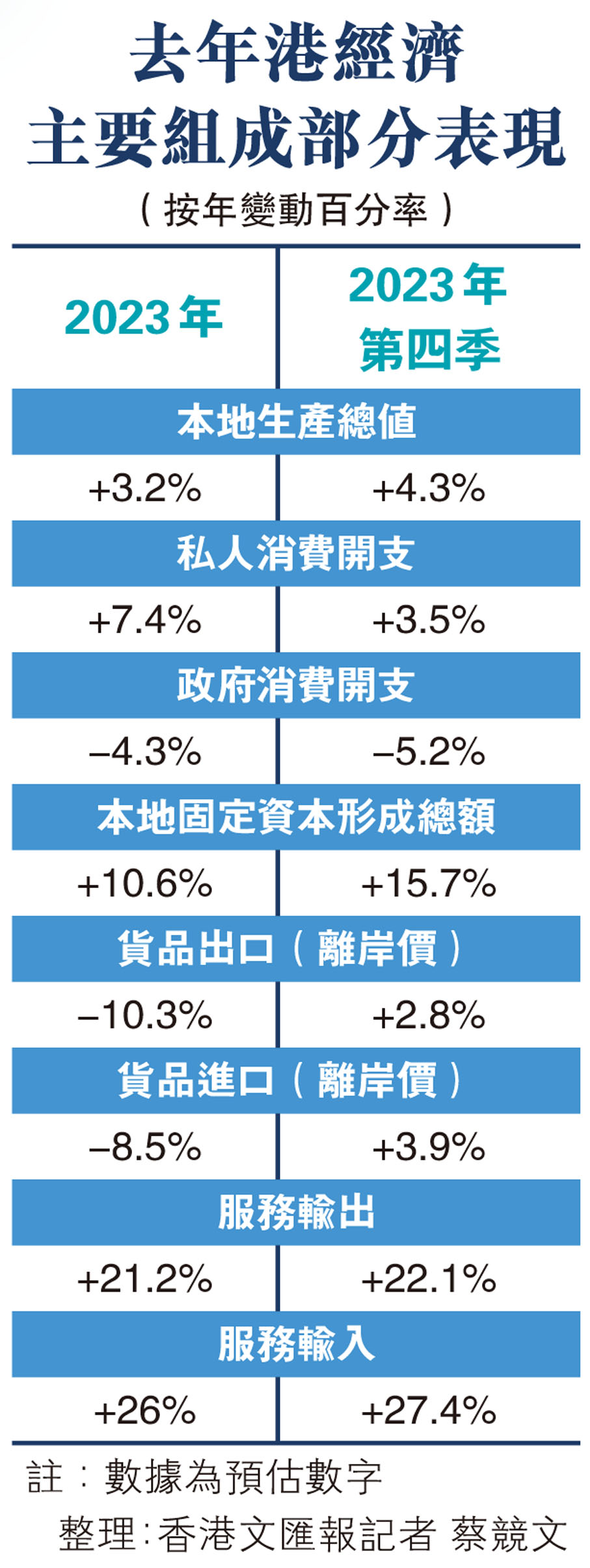 政府發言人昨表示,香港經濟在2023年第四季繼續恢復,訪港旅遊業和私人消費仍然是主要動力。實質本地生產總值繼2022年收縮3.7%後,2023年全年合計回復3.2%的增長。受惠於訪港旅客人數在香港與內地和國際全面通關後有所恢復,服務輸出展現強勁反彈。在市民收入上升及政府多項措施的支持下,私人消費開支在防疫措施取消後轉為顯著上升。整體投資開支隨着經濟復甦而轉跌為升;不過,年內整體貨物出口進一步下跌。