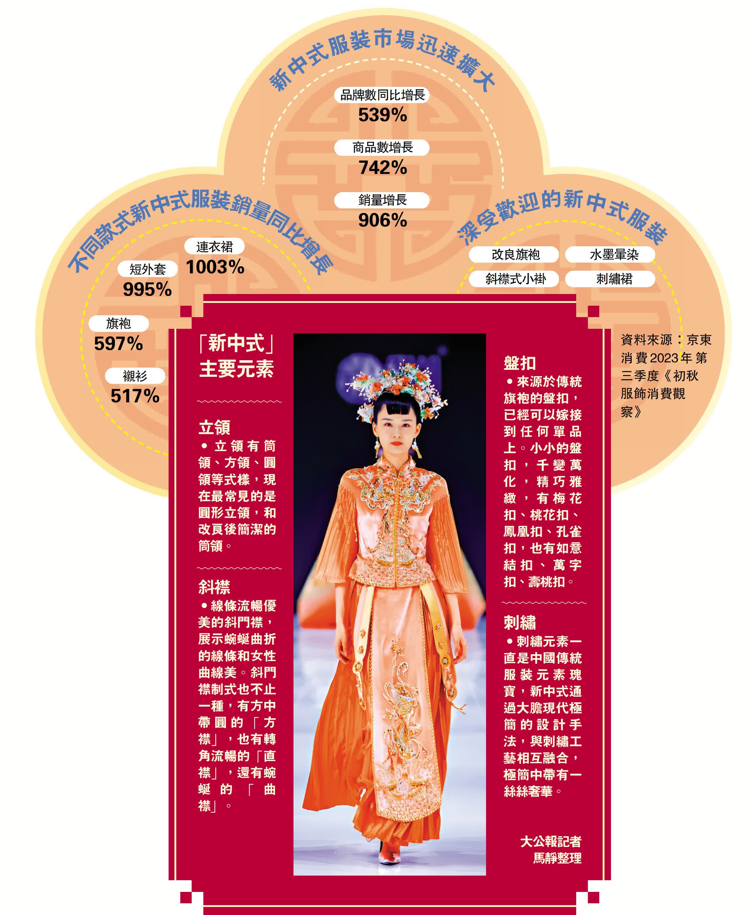 (大公報記者 馬靜)盤扣、立領、斜襟、刺繡……滿是傳統中國風的新中式服裝,在甲辰龍年到來之前熱度暴增,成為眾多消費者熱捧的新寵。實體店銷量上漲數倍,線上銷售爆單,購物網站搜索量飆升,1月以來,淘寶年貨節平台上「新中式」、「宋錦」的搜索量分別環比暴增683%和2058%。臨近春節,在龐大的年節消費帶動下,新中式流行趨勢加速爆發,越來越多人選購漢服等新中式服裝作為自己的新年戰袍,傳統與創新融合碰撞的「新中式」已然成為2024年第一波火出圈的流行趨勢。
