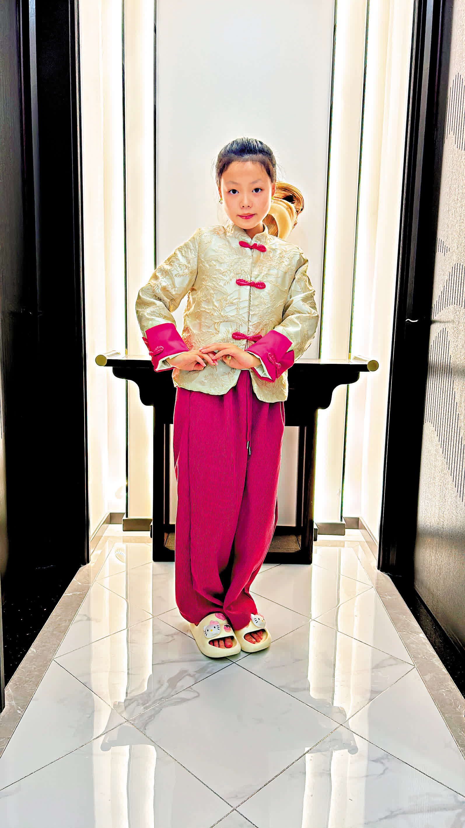 欣欣是一位新晉寶媽,有一個一歲半女寶。她告訴大公報,今年春節,自己買的加上親朋送的,女兒的五六套新衣清一色都是新中式風格,「可見新中式風格真是太火了,既應了春節的景兒,又有傳統特色。改良旗袍、馬甲、外套,還有各種配飾,我閨女從初一到初五,天天都能穿新衣,都是新中式,中國傳統文化還得從娃娃抓起啊!」