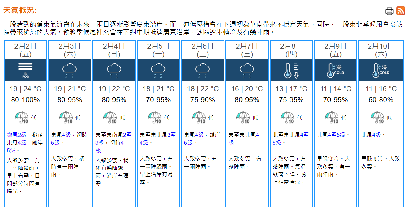 本港今晚及明早有霧,日間部分時間有陽光,氣溫介乎19至24度。吹微風,明日稍後轉吹和緩東風,離岸風勢清勁。星期六風勢較大。星期日仍然潮濕。隨後一兩日天氣稍涼。農曆新年前有幾陣雨,氣溫顯著下降。