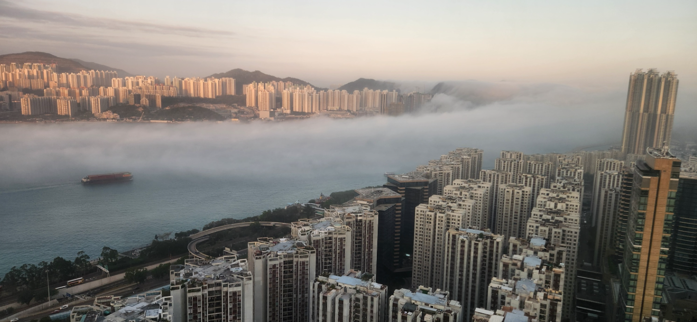 本港今日多處出現霧氣繚繞景象。在港島南香港仔,大公文匯全媒體記者拍攝到香港仔避風塘、鴨脷洲等地,多棟大樓被濕氣、霧氣包圍,頗有「海市蜃樓」之感。在港島南區薄扶林置富花園對開海面出現難得一見的「霧牆」景觀。綿長的白色濃霧橫貫在波光粼粼的海面上,宛如一副巨牆,把海面一分為二,甚為壯觀。