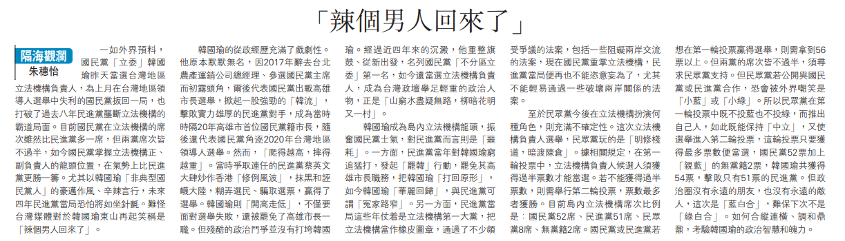 一如外界預料,國民黨「立委」韓國瑜昨天當選台灣地區立法機構負責人,為上月在台灣地區領導人選舉中失利的國民黨扳回一局,也打破了過去八年民進黨壟斷立法機構的霸道局面。目前國民黨在立法機構的席次雖然比民進黨多一席,但兩黨席次皆不過半,如今國民黨掌握立法機構正、副負責人的龍頭位置,在氣勢上比民進黨更勝一籌。尤其以韓國瑜「非典型國民黨人」的豪邁作風、辛辣言行,未來四年民進黨當局恐怕將如坐針氈。難怪台灣媒體對於韓國瑜東山再起笑稱是「辣個男人回來了」。