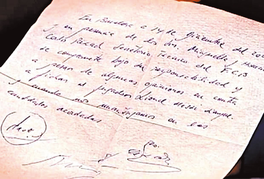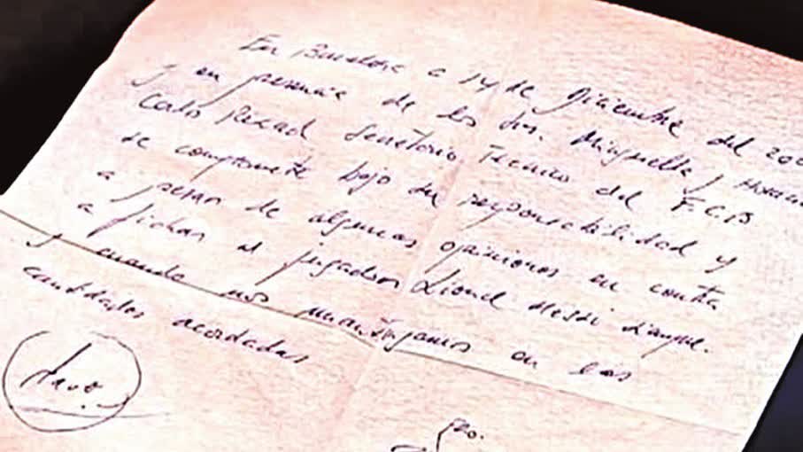 這張餐巾紙合約的日期是2000年12月14日,上面寫着,在顧問和經理人見證下,列薩治履行職權,無論有任何反對意見,只要遵守商定金額,就和美斯簽約,但餐巾紙上沒有美斯本人簽名。一個月後,美斯正式加盟巴塞隆拿,隨後成為全球知名球星。
