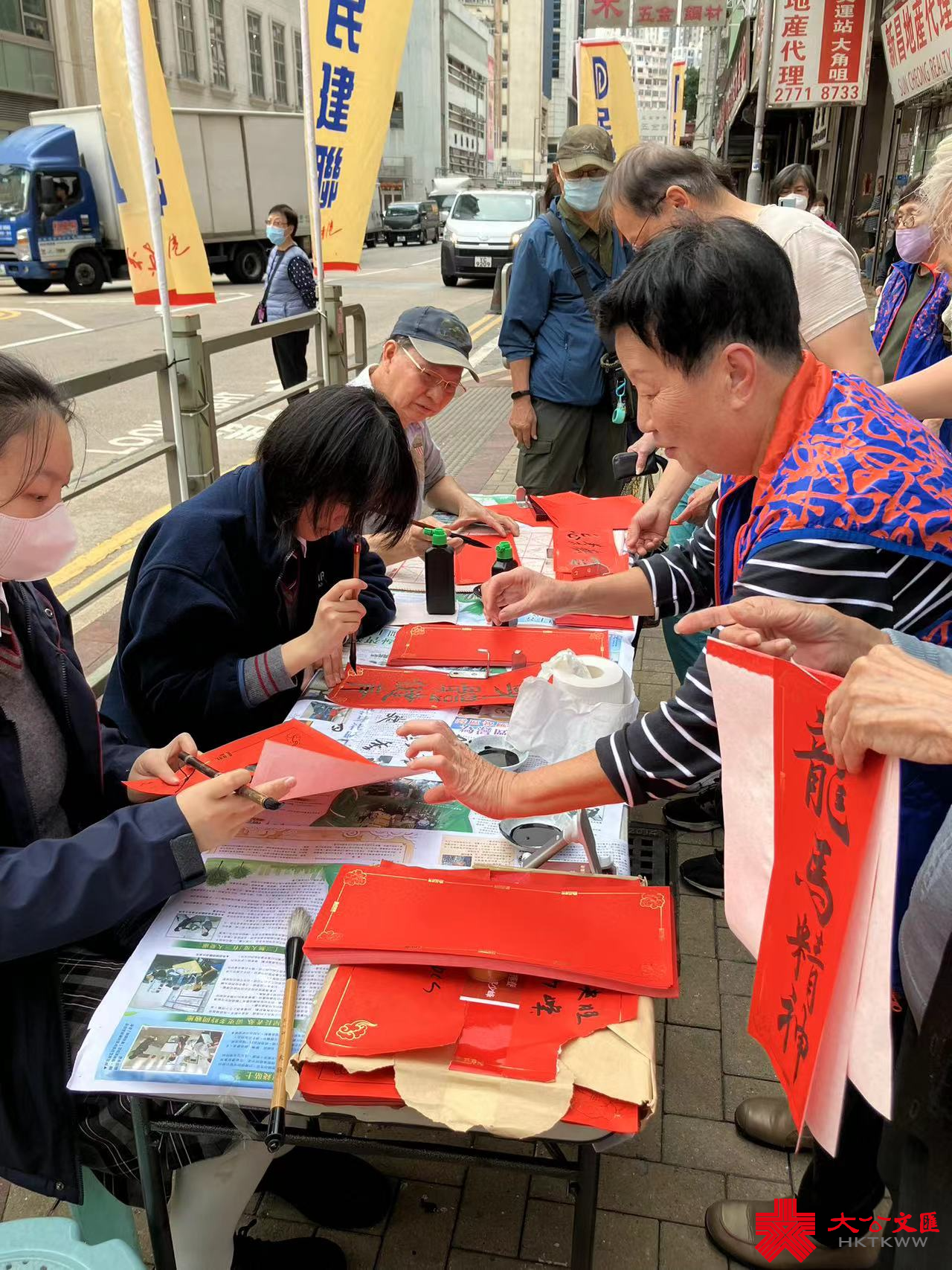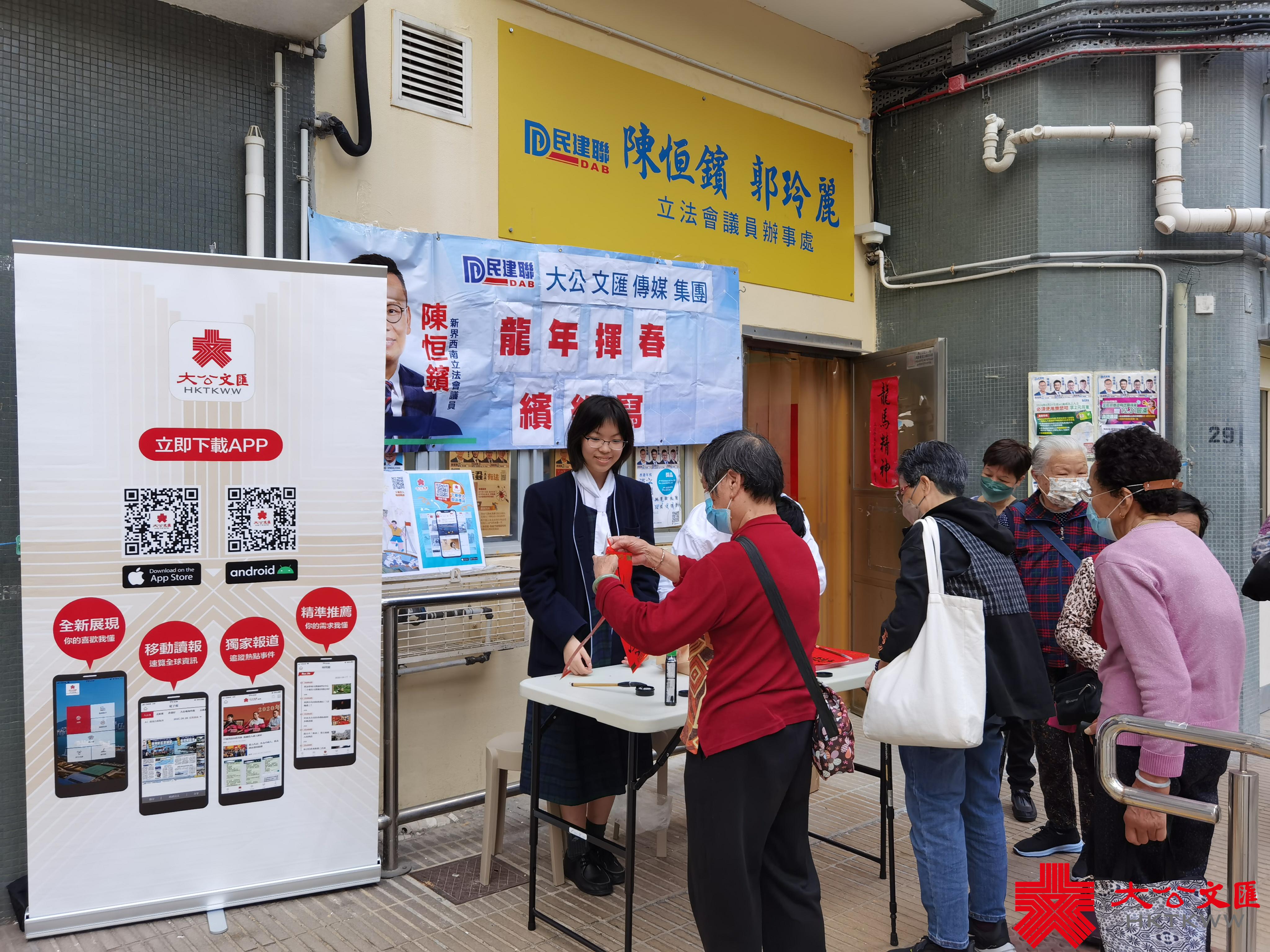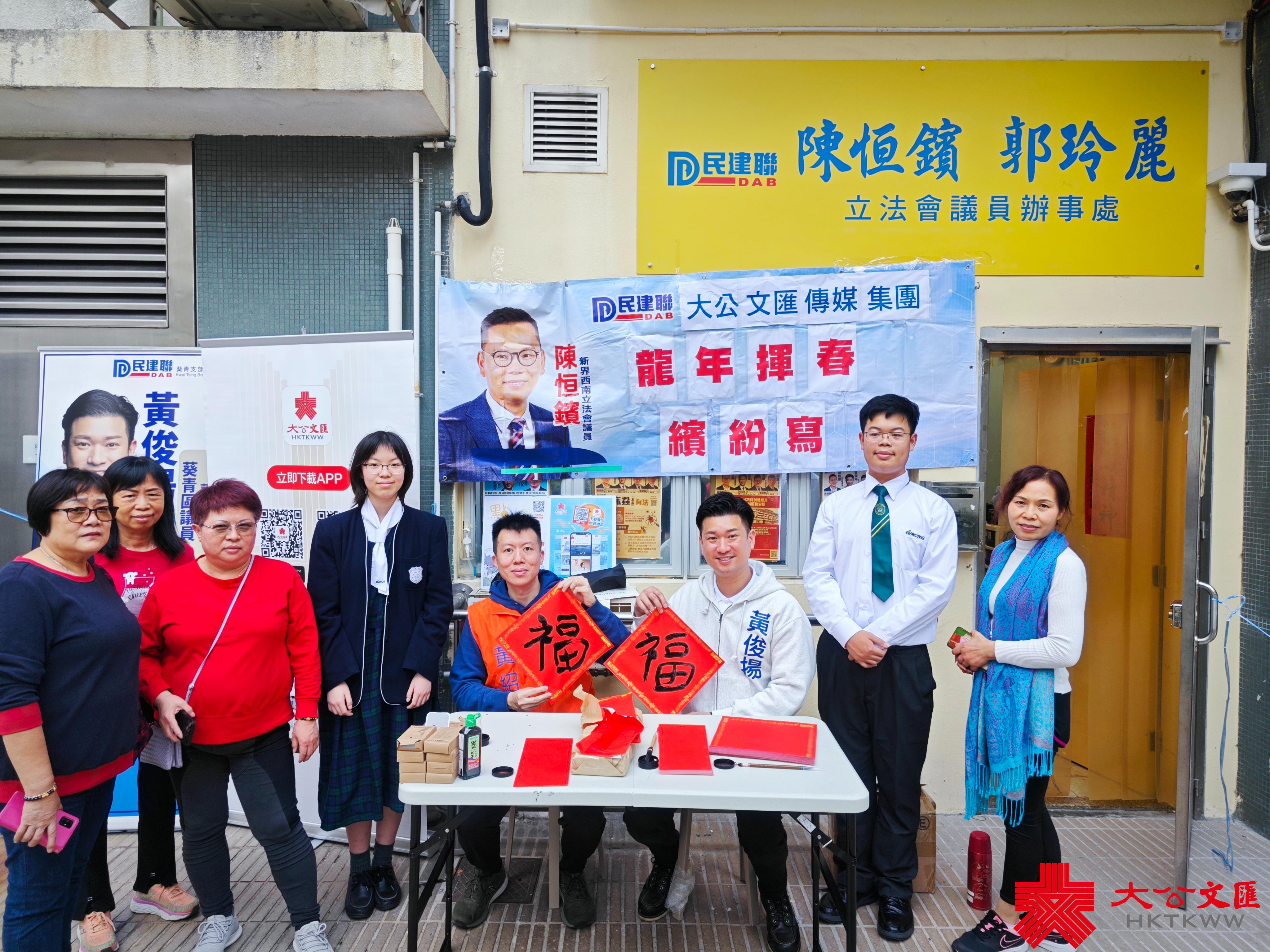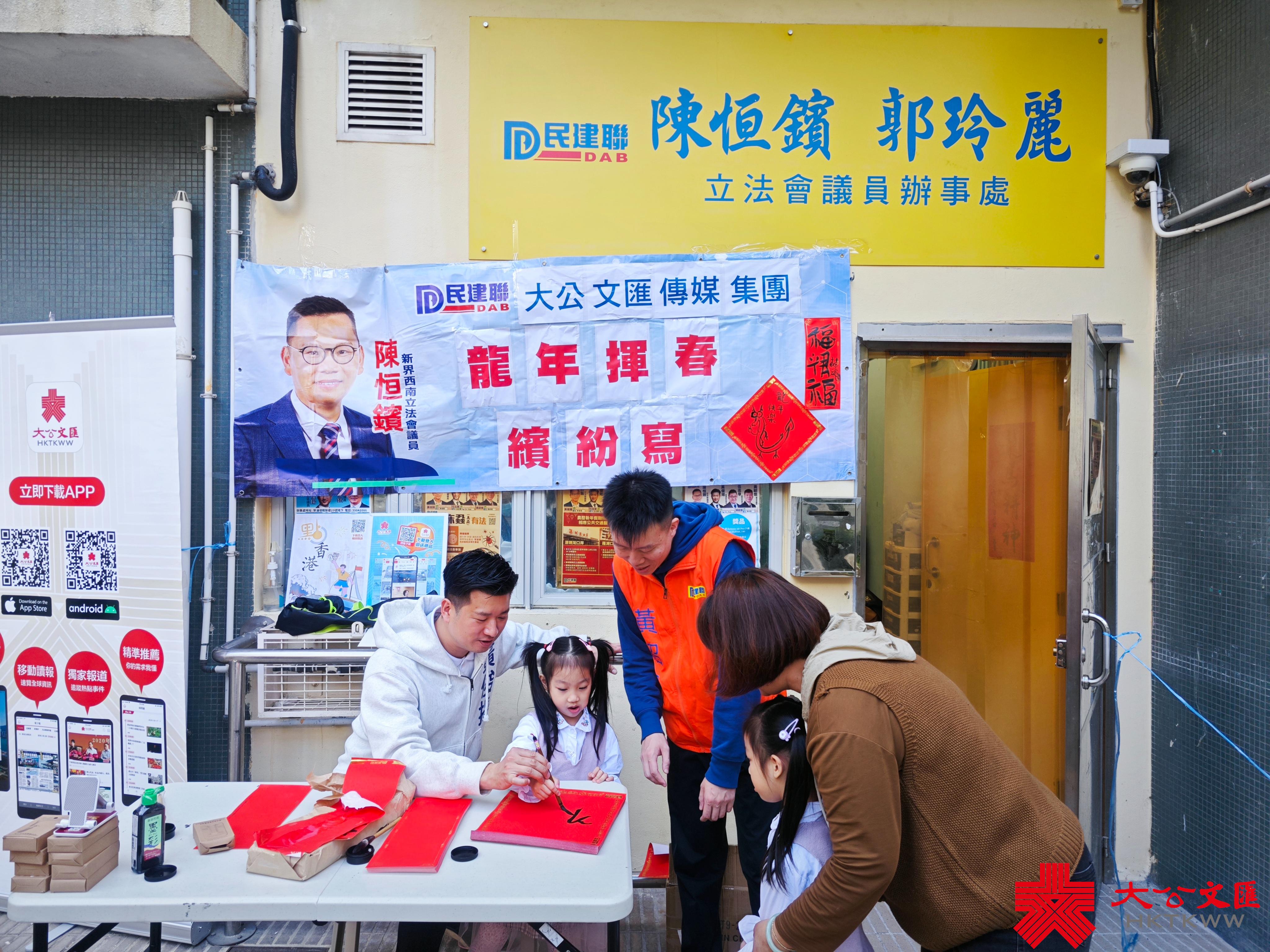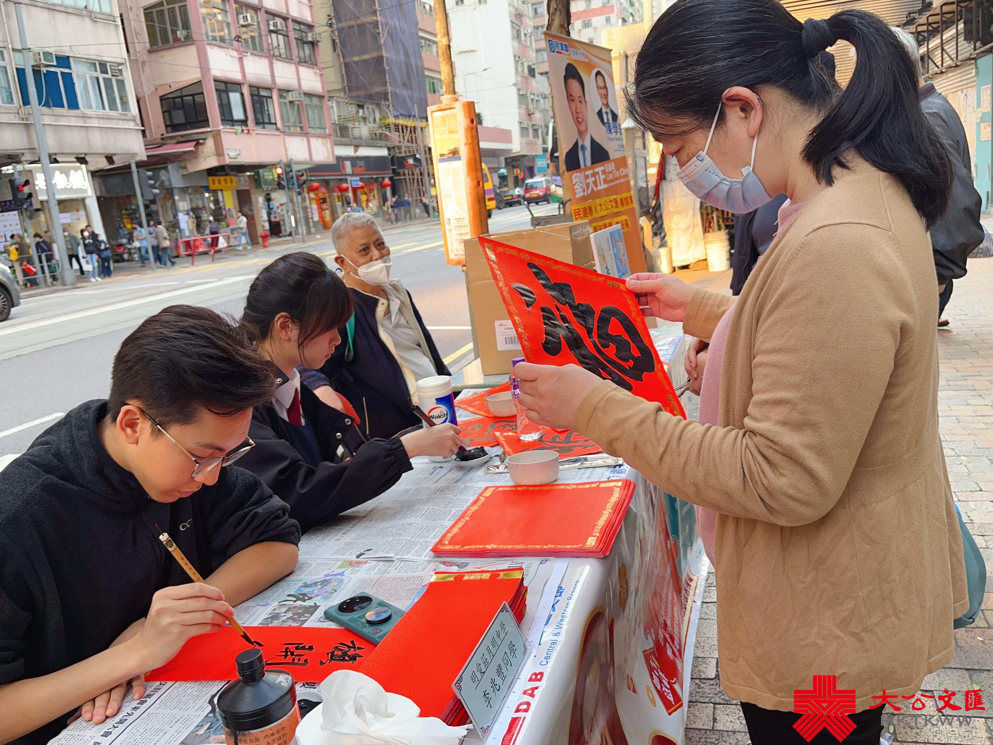大公文匯全媒體報道,香港大公文匯傳媒集團與民建聯攜手合作,於油尖旺區、中西區和葵青區,一連三日舉行「龍年揮春繽紛寫」活動,並邀請了「香港青少年書法大獎賽」中得獎學生現場為市民寫揮春,為即將到來的農曆新年增添氣氛。