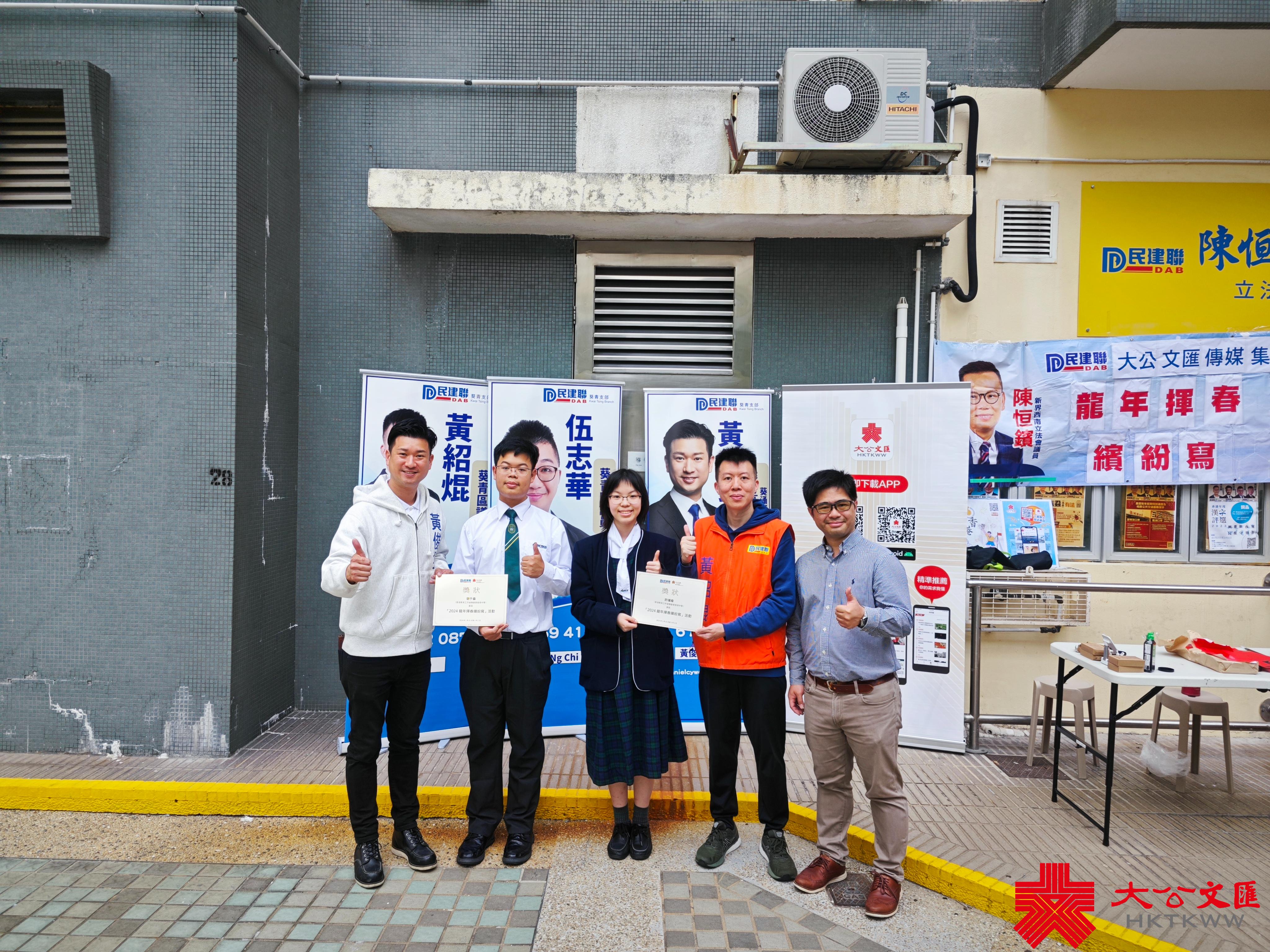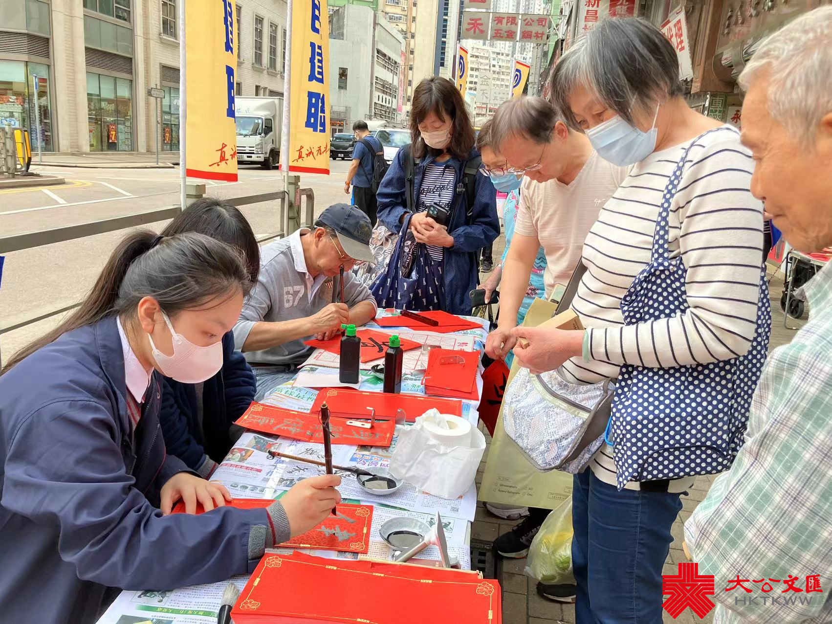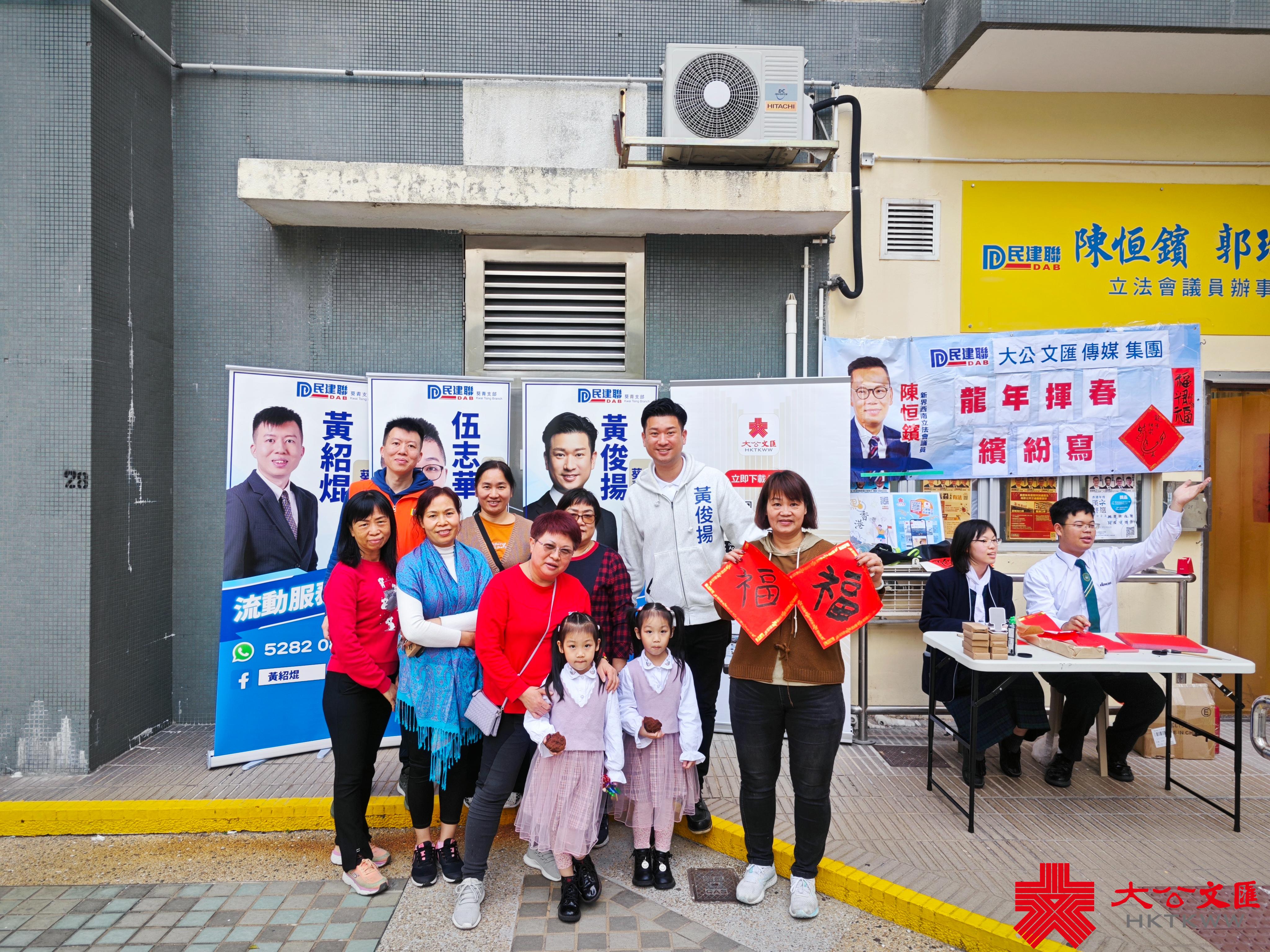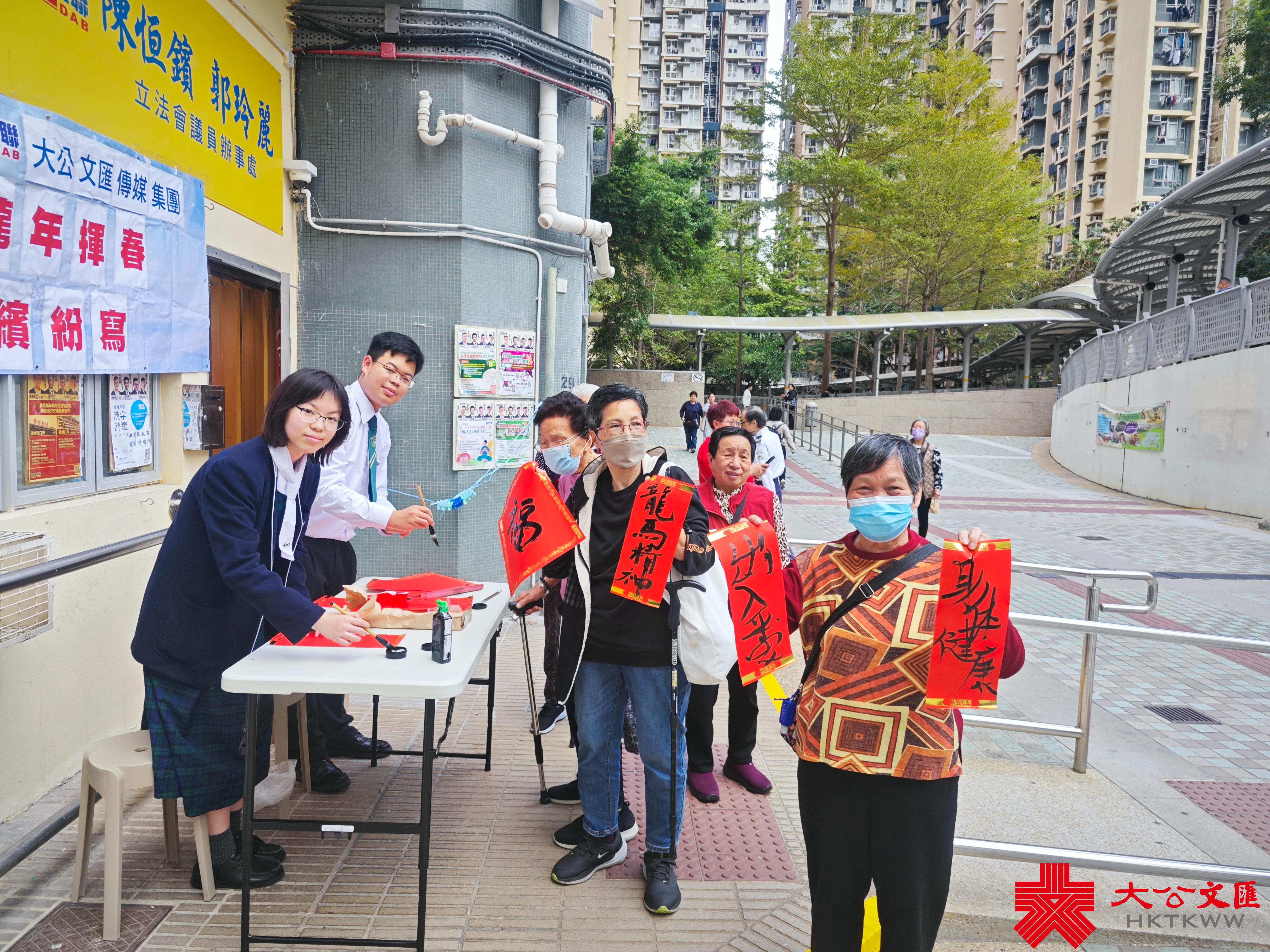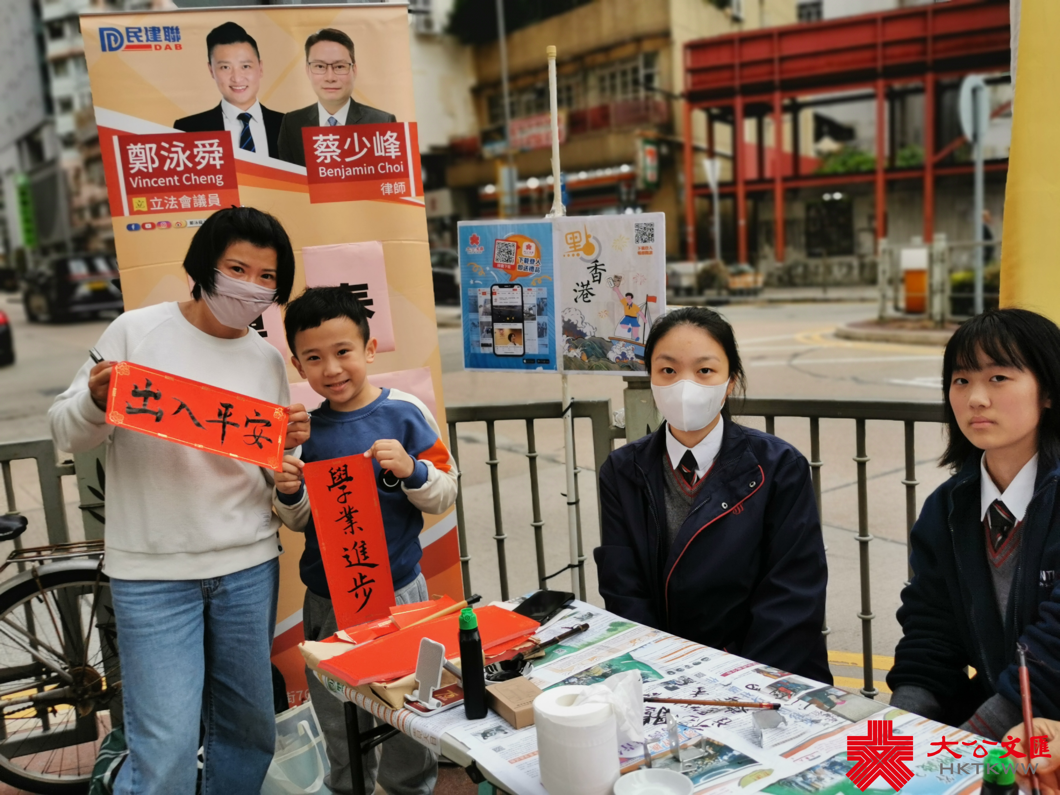 大公文匯全媒體報道,香港大公文匯傳媒集團與民建聯攜手合作,於油尖旺區、中西區和葵青區,一連三日舉行「龍年揮春繽紛寫」活動,並邀請了「香港青少年書法大獎賽」中得獎學生現場為市民寫揮春,為即將到來的農曆新年增添氣氛。