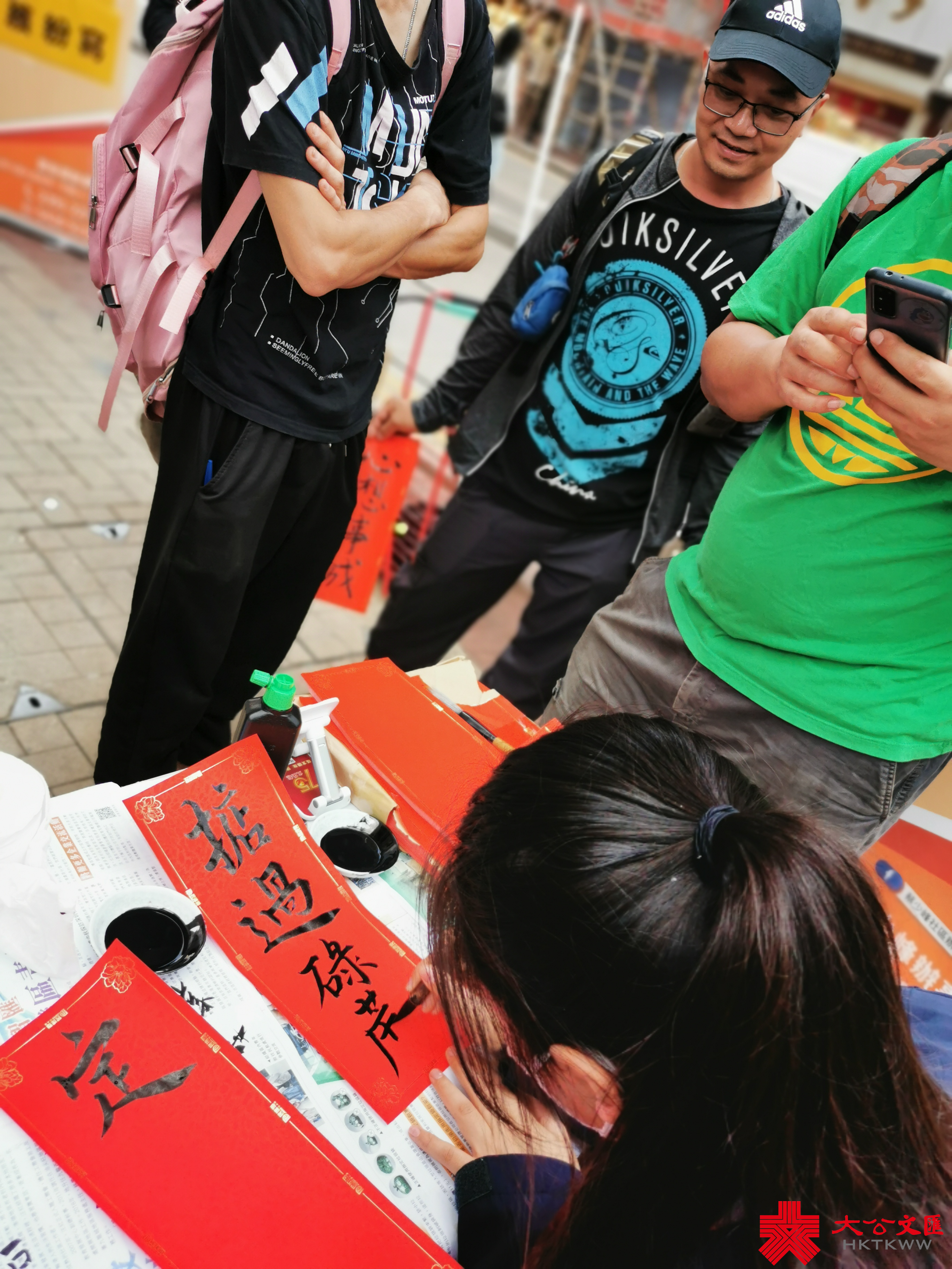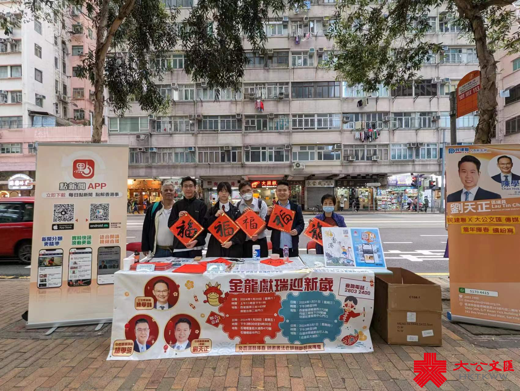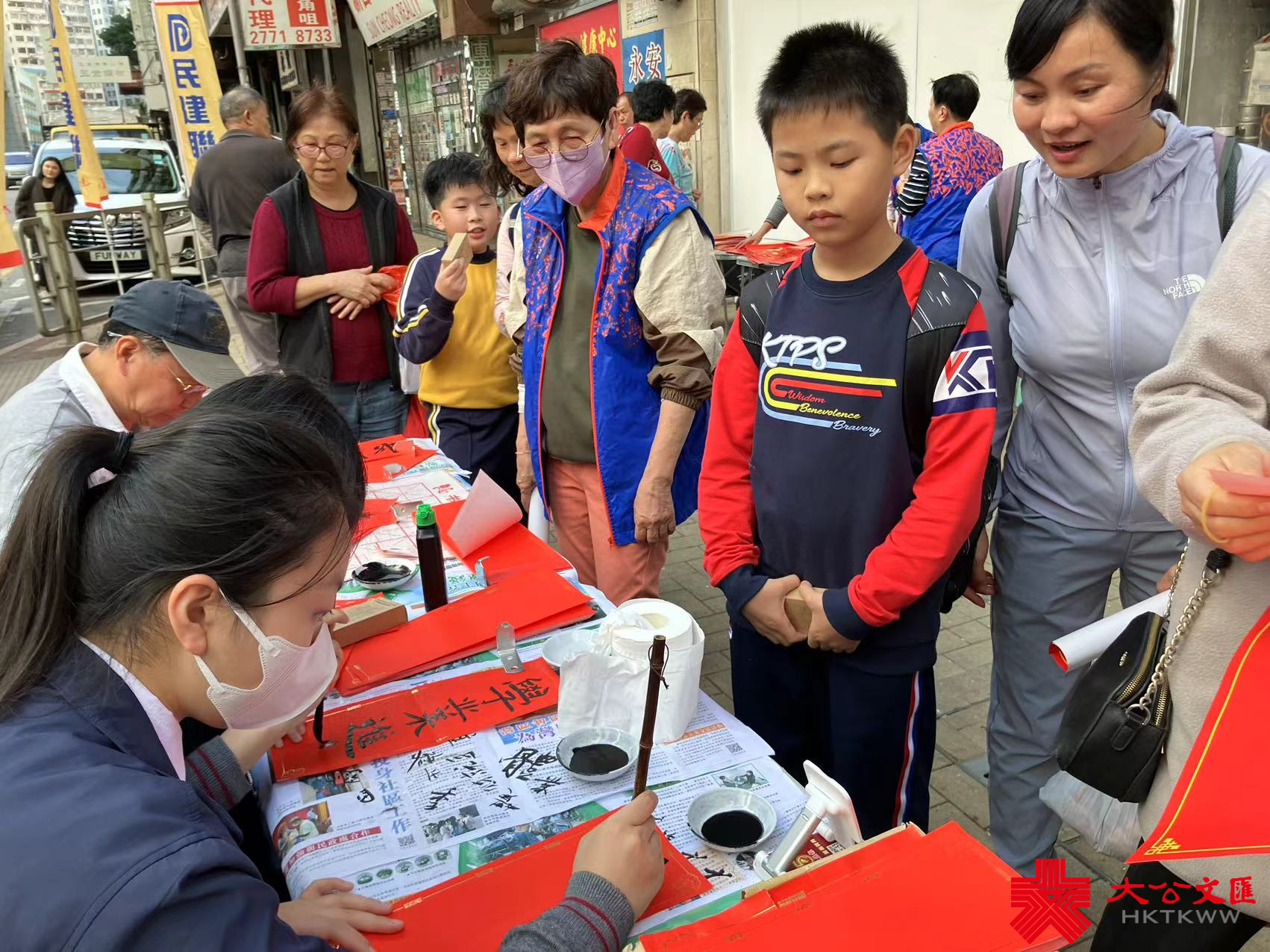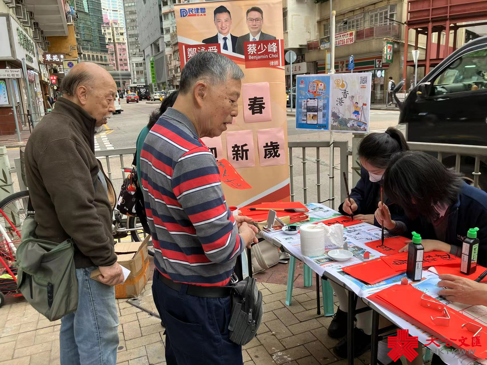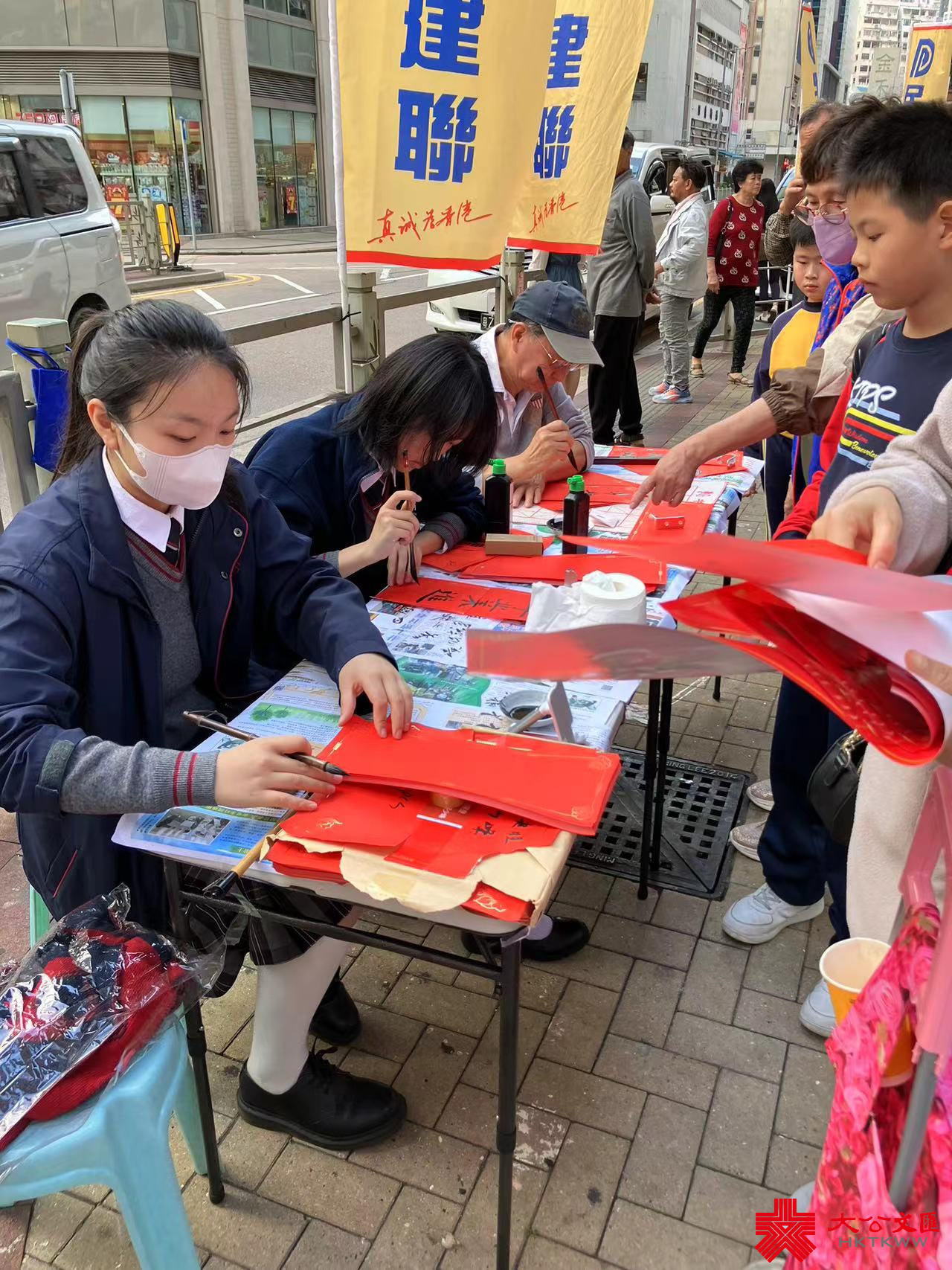 大公文匯全媒體報道,香港大公文匯傳媒集團與民建聯攜手合作,於油尖旺區、中西區和葵青區,一連三日舉行「龍年揮春繽紛寫」活動,並邀請了「香港青少年書法大獎賽」中得獎學生現場為市民寫揮春,為即將到來的農曆新年增添氣氛。
