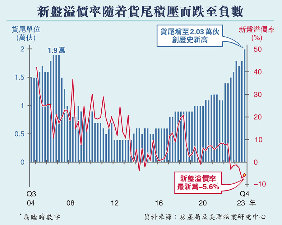 隨着積壓的單位增加,新盤的溢價率亦反覆向下,最近一年多來更跌至負數(即新盤價錢平過二手,見表)。美聯物業首席分析師劉嘉輝指,即使發展商已減價推盤,但一手銷售成績依然不甚理想,連續6季出現「負溢價」,去年第四季新盤溢價率報負5.6%(即新盤售價比同區二手價低5.6%)。