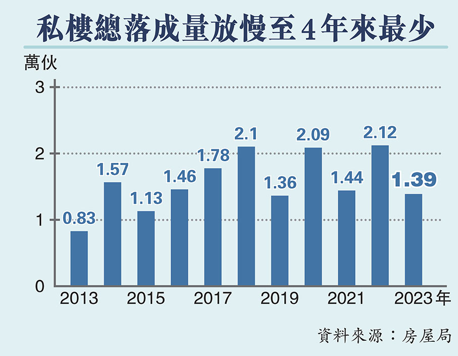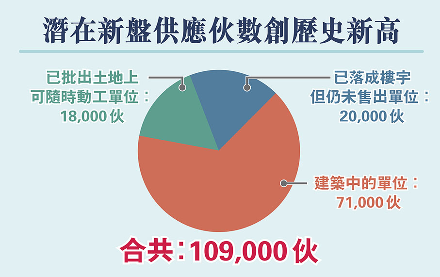 (香港文匯報 記者 黎梓田)特區政府過去積極覓地建屋取得成效。房屋局昨日公布,截至去年底,未來3至4年一手私樓潛在供應約10.9萬伙,創有紀錄新高,按季增2,000伙。10.9萬伙潛在供應中,其中落成但未售出貨尾約2.03萬伙,按季增加2,000個,同創房屋局報告有紀錄以來近二十年新高。有業界人士指出,發展商銷售步伐減慢,但起樓速度未有變慢,可能推升一手私樓潛在供應量至超過11萬伙。團結香港基金認為,經濟大環境未見好轉,樓市未來幾年都有去庫存壓力,建議政府進一步「減辣」甚至「撤辣」。