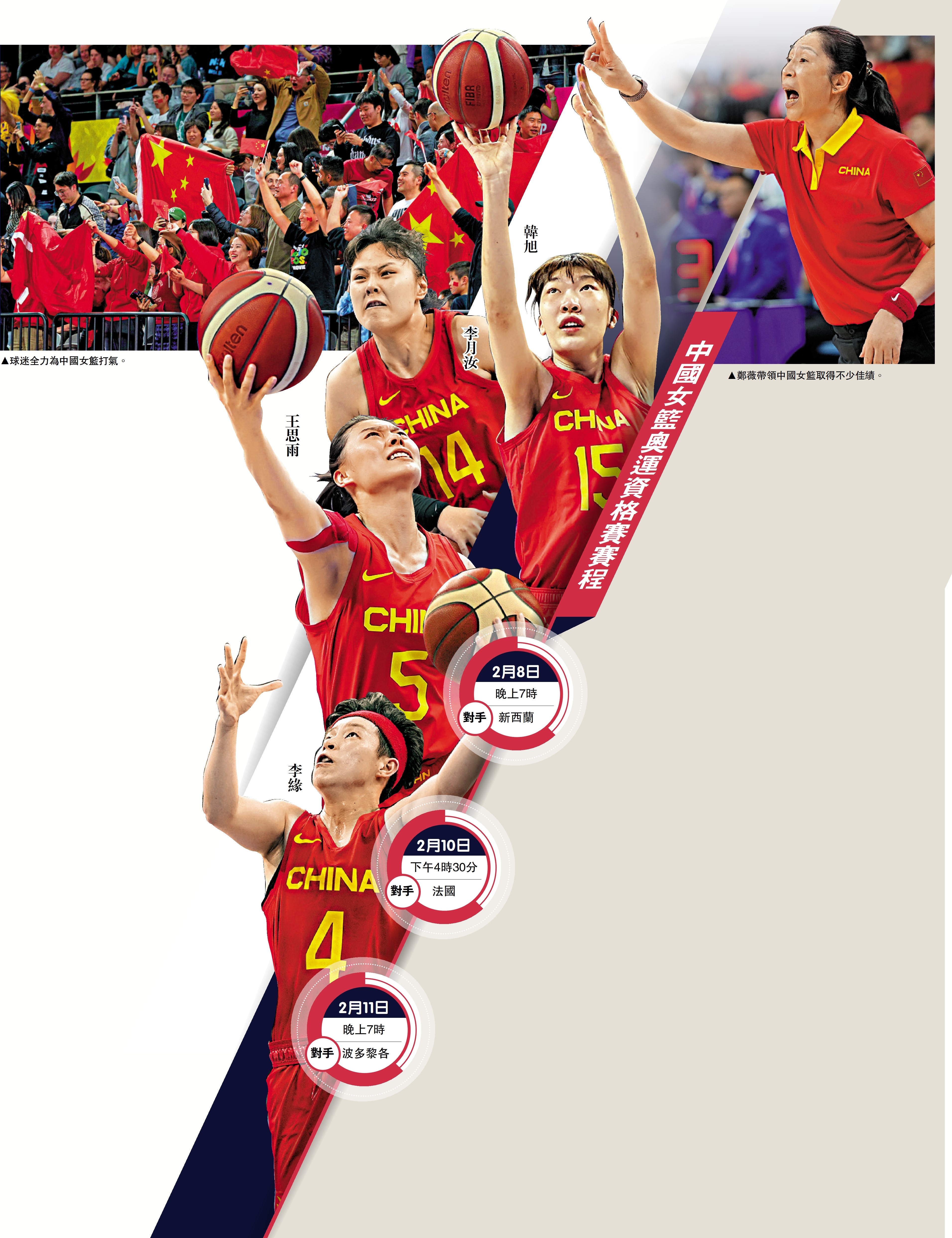 按照國際籃聯公布的女籃奧運資格賽賽程,中國女籃將在2月8日首仗迎戰新西蘭,2月10日次仗迎戰法國,2月11日最後一仗迎戰波多黎各。其中2月10日與法國女籃一戰正值中國農曆大年初一,意味着中國女籃要在賽場上度過龍年新年,中國女籃也希望通過奧運資格賽的良好表現,給國人獻上一份新春賀禮。