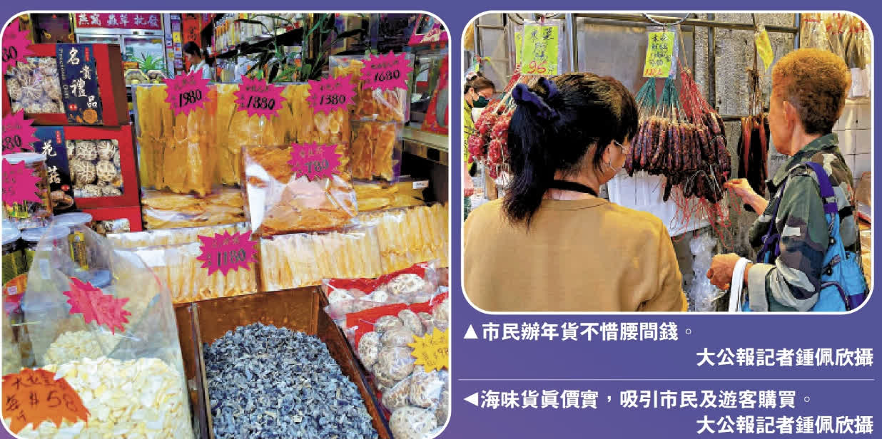 安記海味董事總經理潘權輝向《大公報》表示,花膠、蝦米等同是新加坡、馬來西亞旅客的心頭好,他們對香港品牌有信心,「香港集中靚貨,貨量又齊全」,人均消費約3000元,甚至高達過萬元。他說,復常以來市民更偏向外出用膳,農曆新年前夕酒樓訂座率已回復至疫前八成,他認為香港整體新年氣氛欠缺,導致消費意慾未如理想,相信政府舉辦花車巡遊、維港煙花等活動,有助帶動氣氛。
