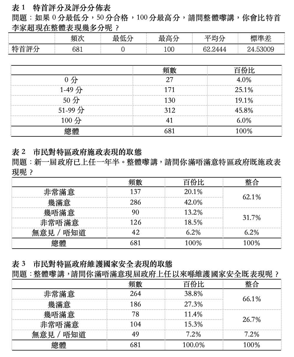 特首整體評分超過60分 逾六成受訪市民滿意特區政府施政表現