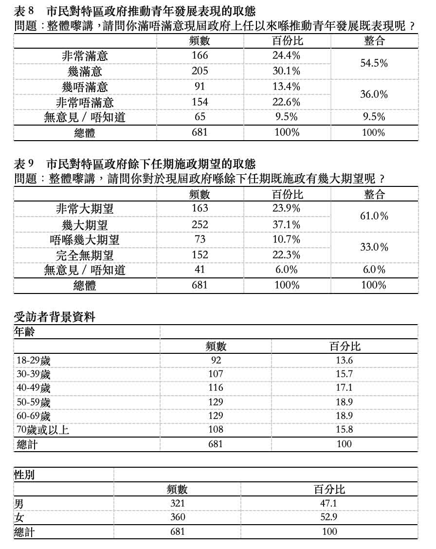 特區政府在2023年公布《青年發展藍圖》,各項支持青年發展的具體措施陸續推出,包括設立「青年專員」,擴大「青年委員自薦計劃」,在全港18區成立地區青年社區建設委員會和地區青年發展及公民教育委員會等。調查結果顯示有54.5%受訪者傾向滿意特區政府過去一年推動青年發展的工作(見表8)。