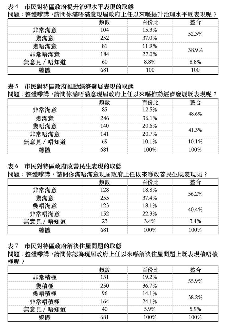 新一屆特區政府「以結果為目標」,致力提升治理水平,在不同領域完善治理體系,包括成立「特首政策組」,提升政府對長遠和策略性議題的研究和倡議能力;同時更新《公務員守則》,強化公務員培訓,優化現行動員機制,提倡「能做事、做成事」的政府文化。調查結果顯示有52.3%受訪市民對有關提升治理水平的表現表示傾向滿意,表示傾向不滿意的則有38.9%(見表4)。