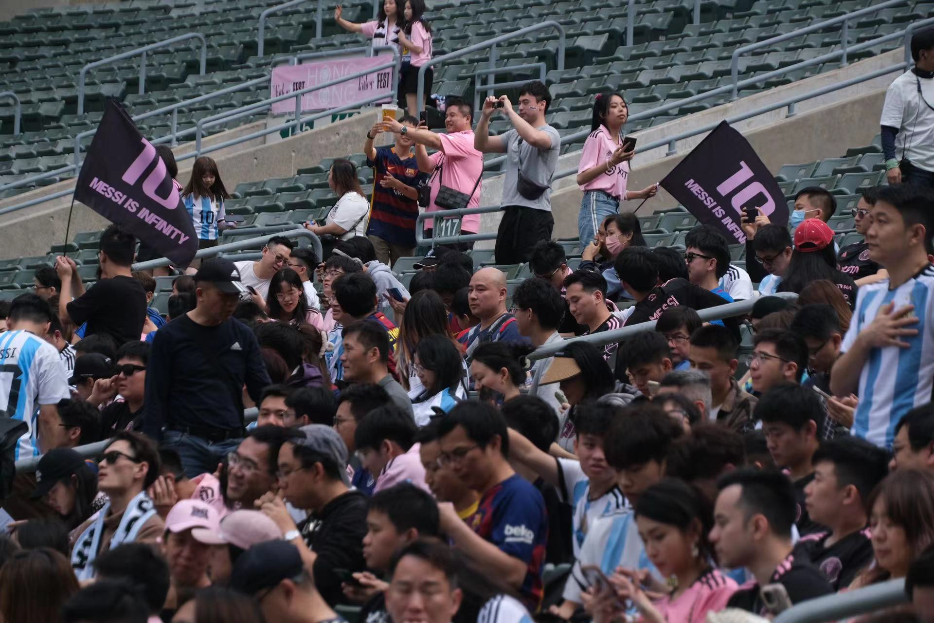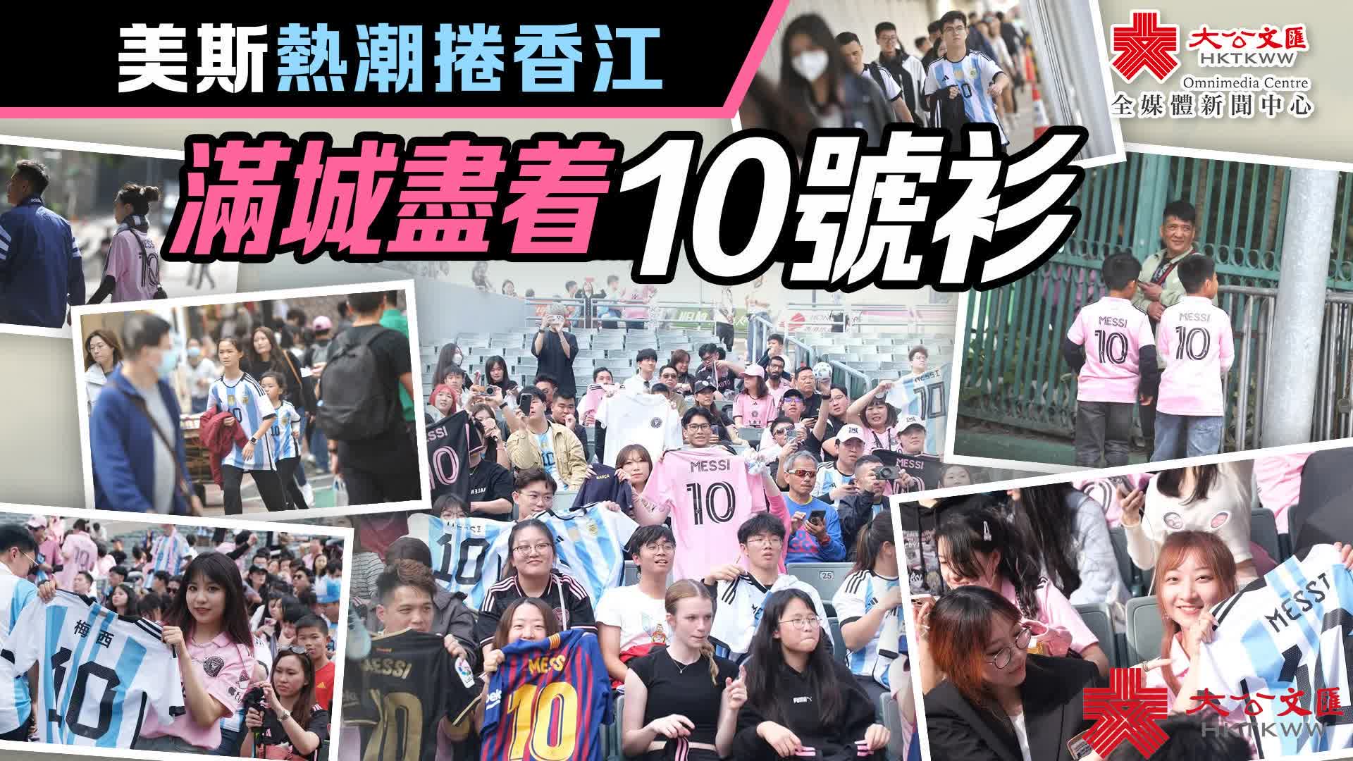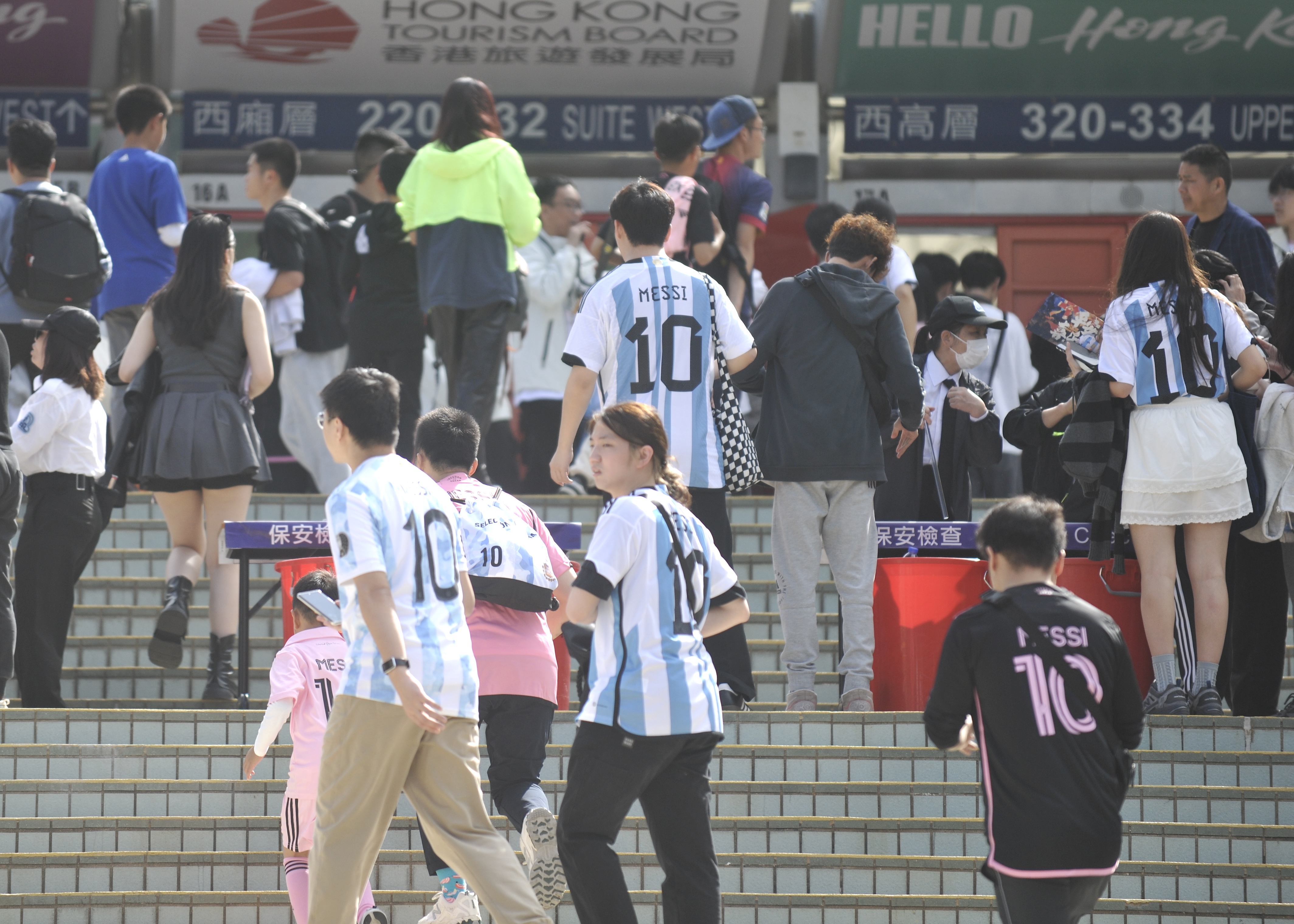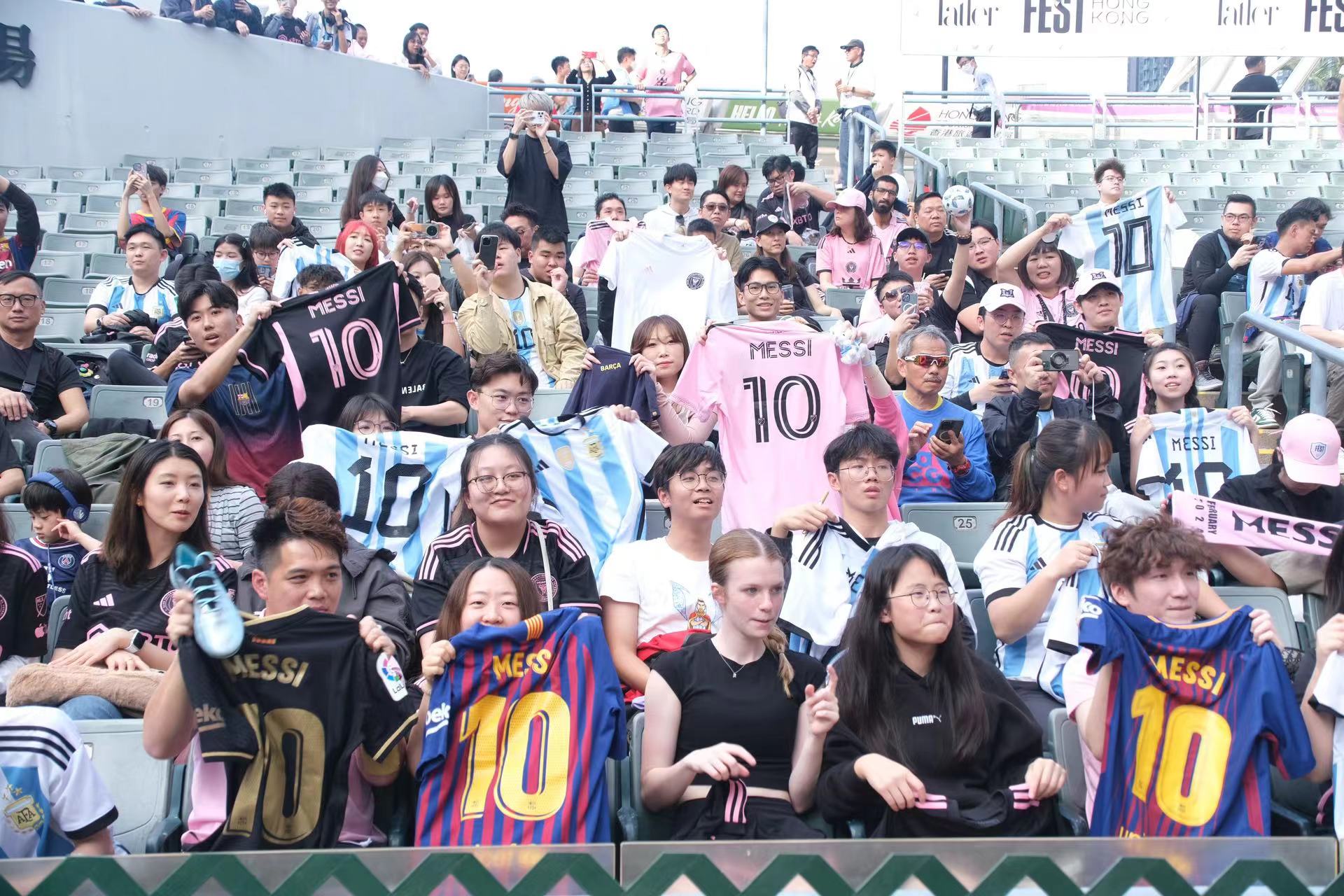 持票人士今日下午2時半起陸續入場,無數球迷身穿或展示美斯不同時期的球衣,包括阿根廷國家隊、西甲巴塞羅那、法甲巴黎聖日門和國際邁阿密,一時間美斯戰袍「10號球衣」幾乎成了球迷們的隊服,撐起球場「半邊天」。