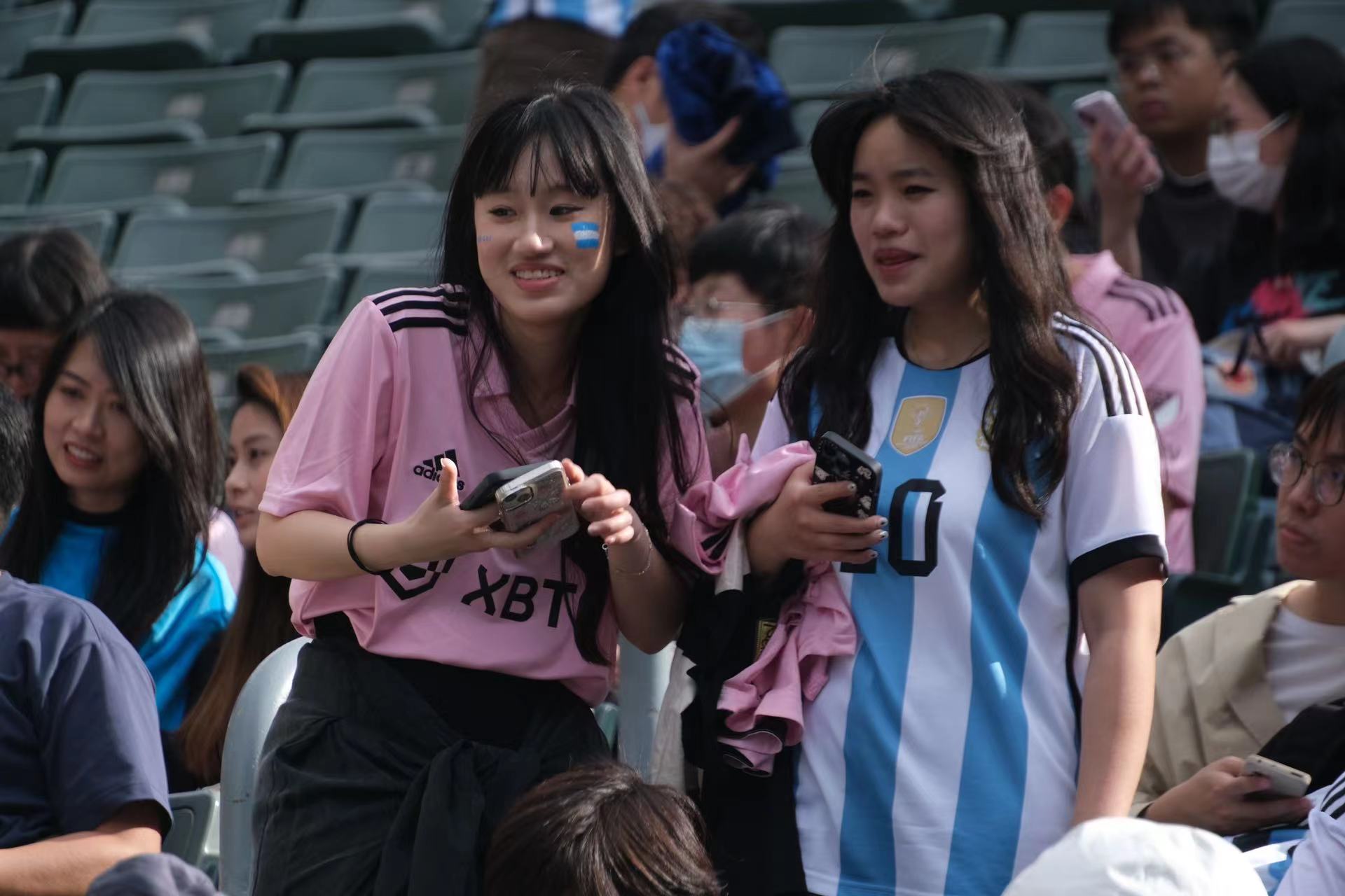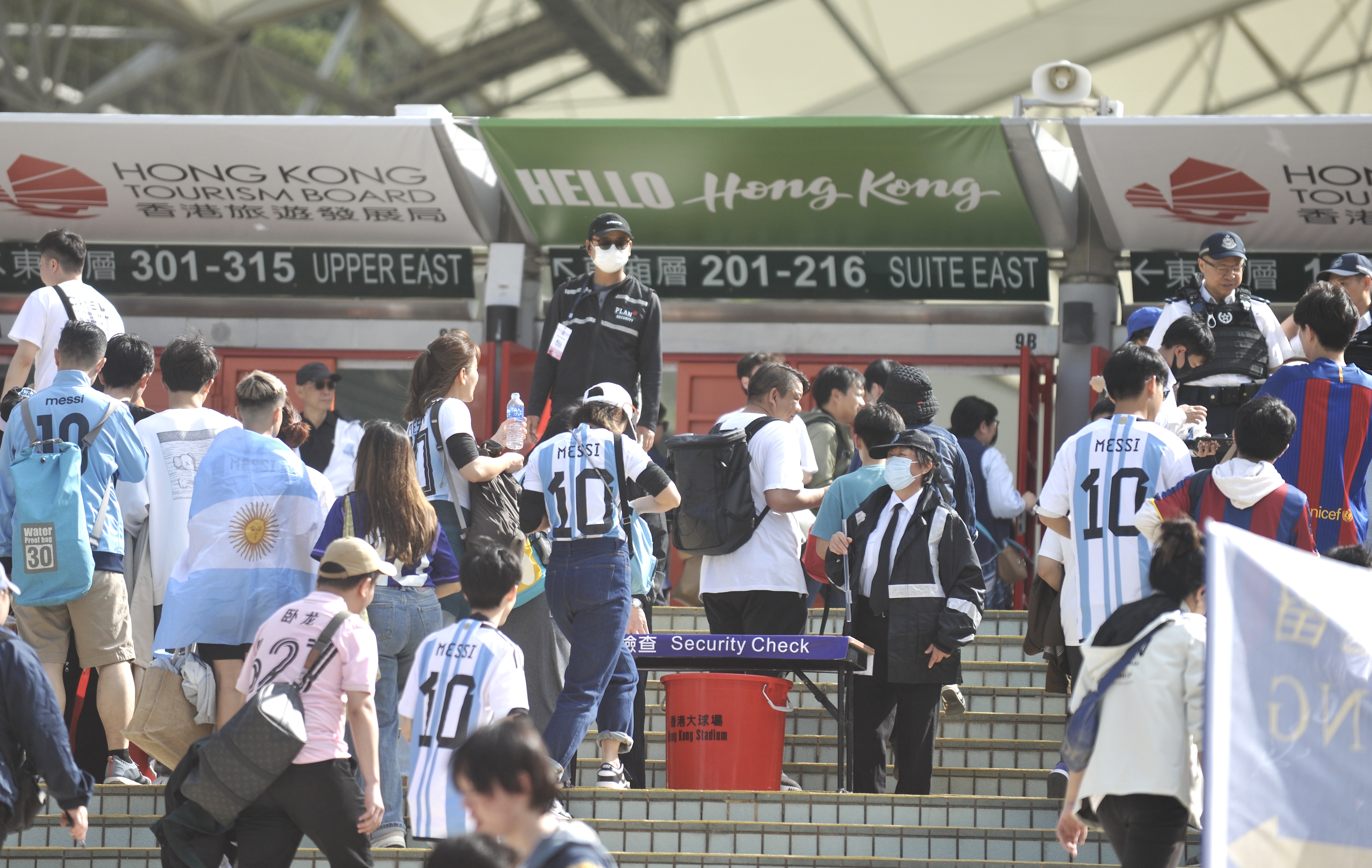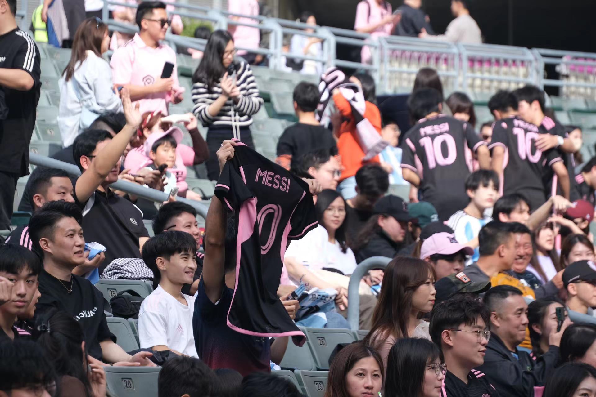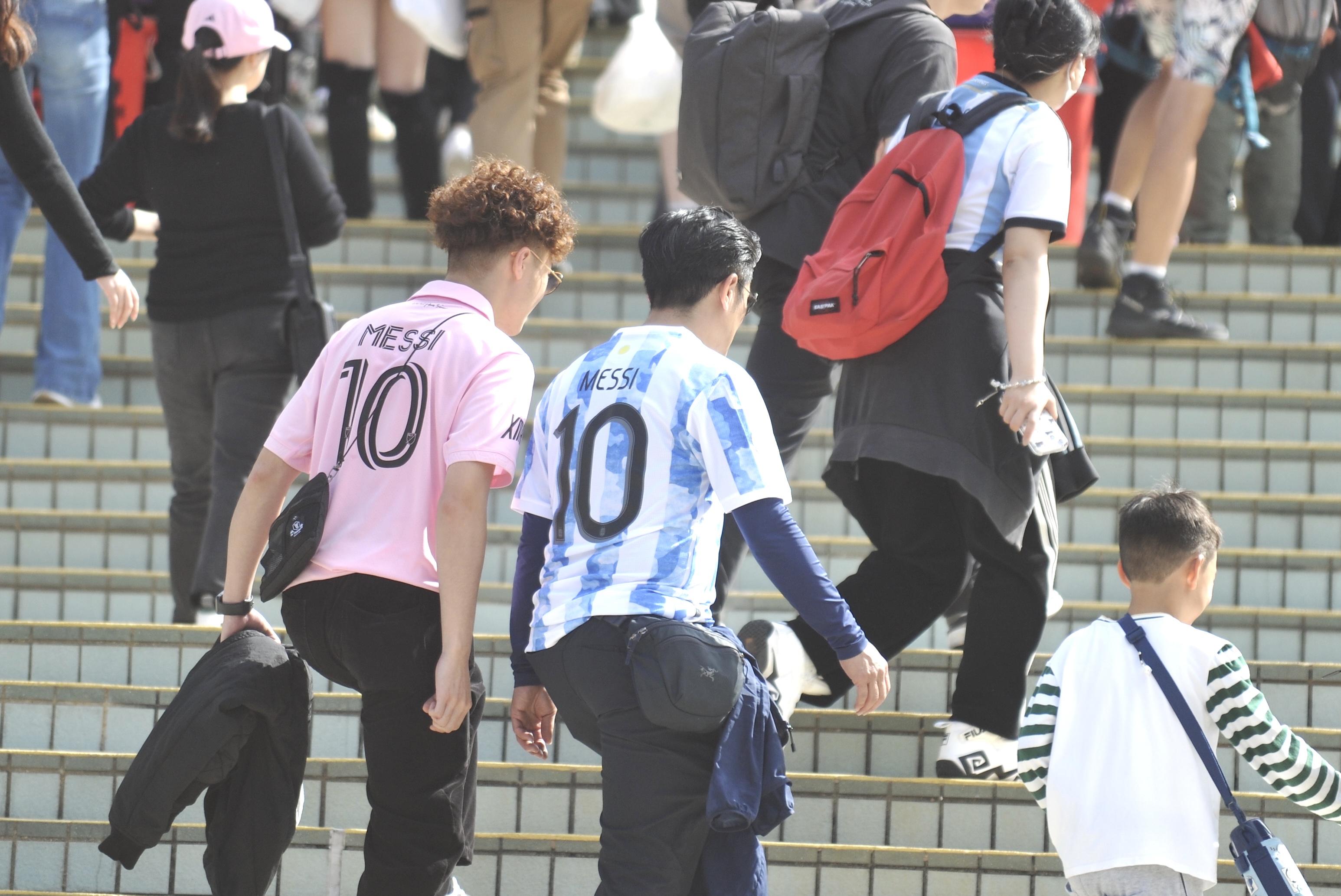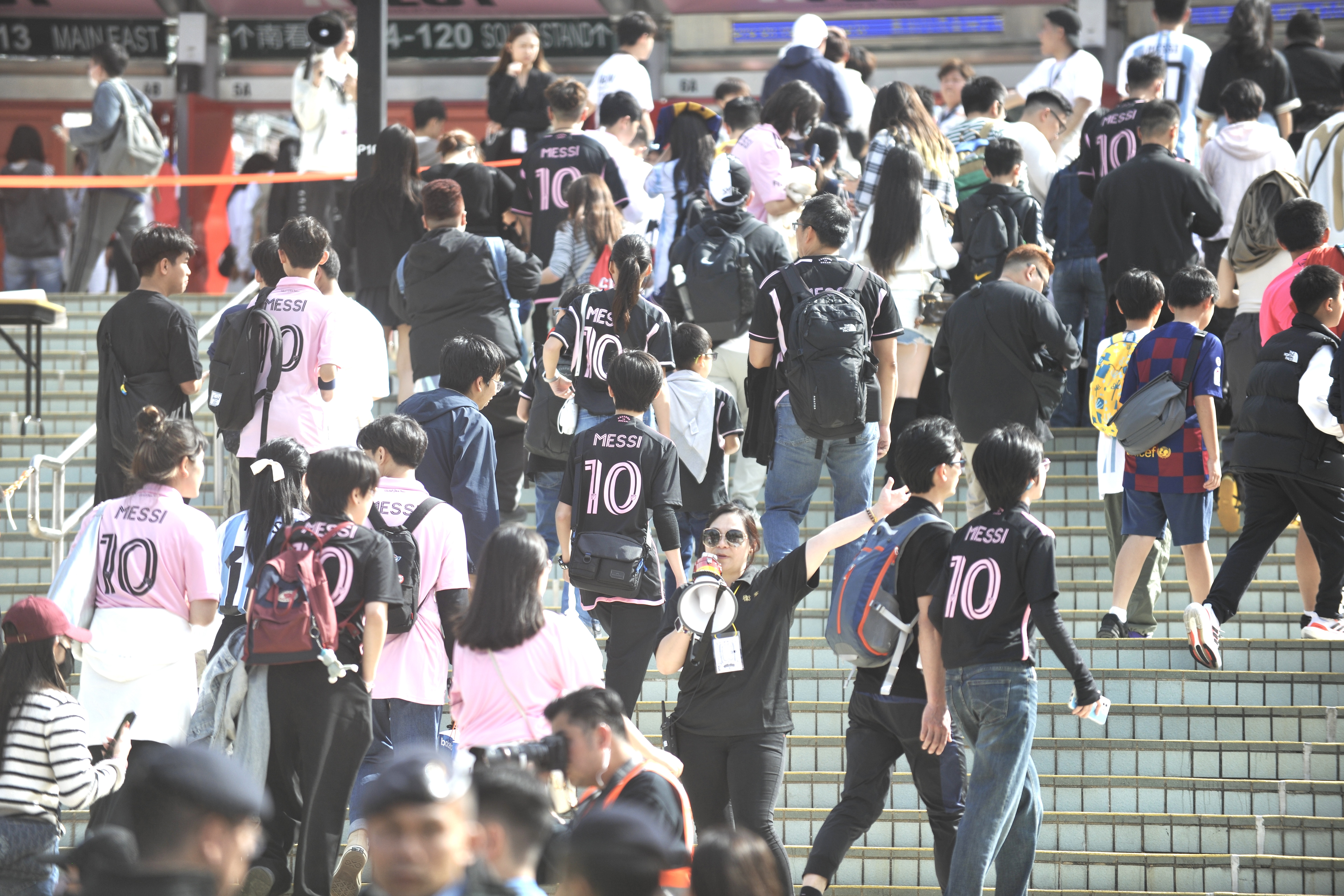 持票人士今日下午2時半起陸續入場,無數球迷身穿或展示美斯不同時期的球衣,包括阿根廷國家隊、西甲巴塞羅那、法甲巴黎聖日門和國際邁阿密,一時間美斯戰袍「10號球衣」幾乎成了球迷們的隊服,撐起球場「半邊天」。