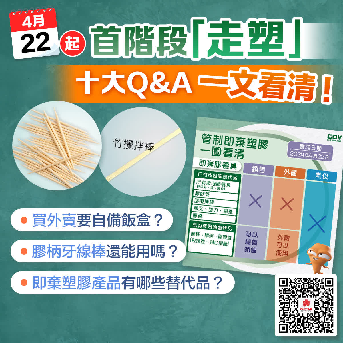 大公文匯全媒體報道,本港將在4月22日起管制即棄塑膠產品,包括禁止食肆提供或銷售9類即棄塑膠餐具,禁售及免費供應日用品如棉花棒、雨傘袋、膠牙籤等。環境及生態局局長謝展寰今日(4日)發表網誌表示,近日坊間對4月22日開始實施的即棄膠餐具和其他塑膠產品管制有不少誤傳須要糾正。