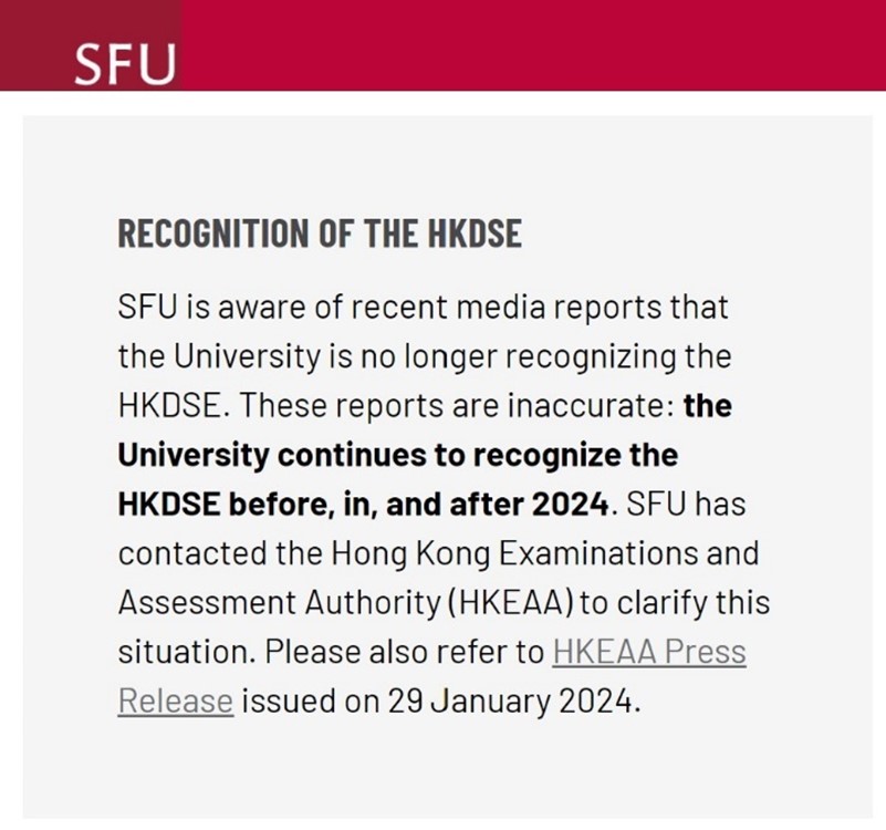 考評局表示,自前年年初已向約300間海外的高等院校解說,過去大半年亦向院校跟進。不少海外院校已配合考評局的工作,加快更新其收生要求。截至今日,已有275所海外院校將適用於2024年或之後DSE的一般入學要求,上載至網站;另外有27所院校需時更新,但相較上月初,已大幅減少。考評局會繼續加強與院校的聯繫,亦會聯絡相關大學的駐港總領事館,協助院校更新資訊。
