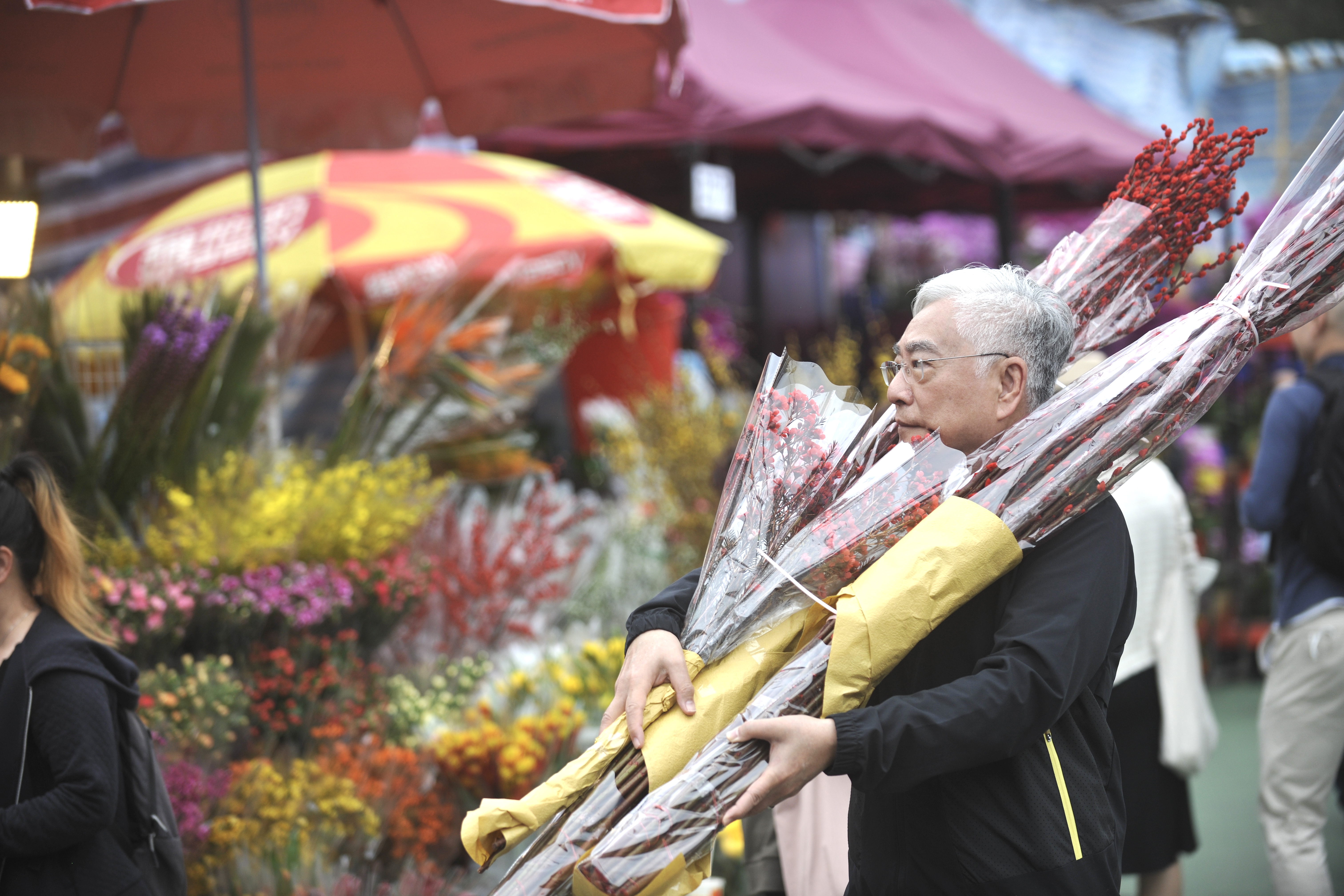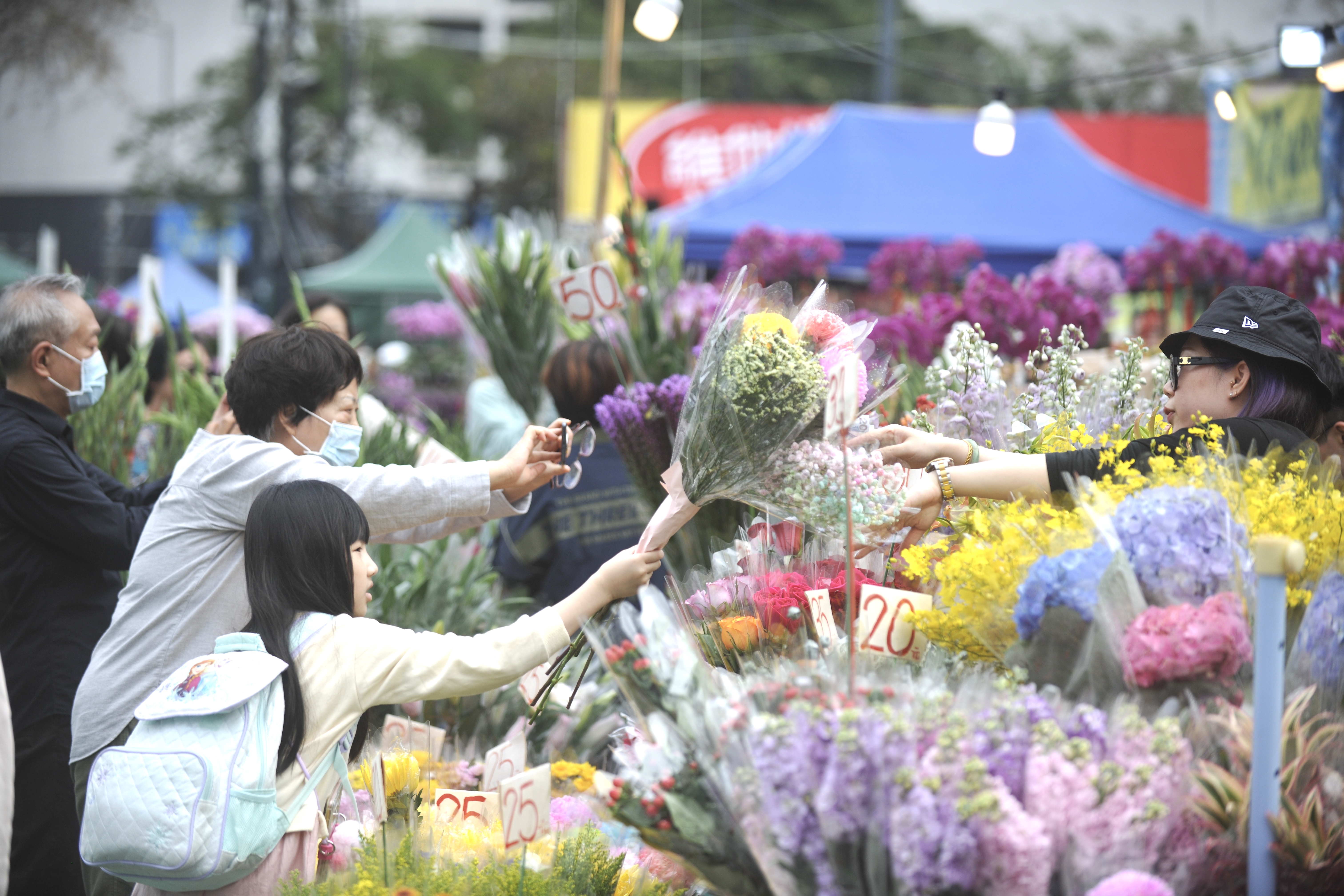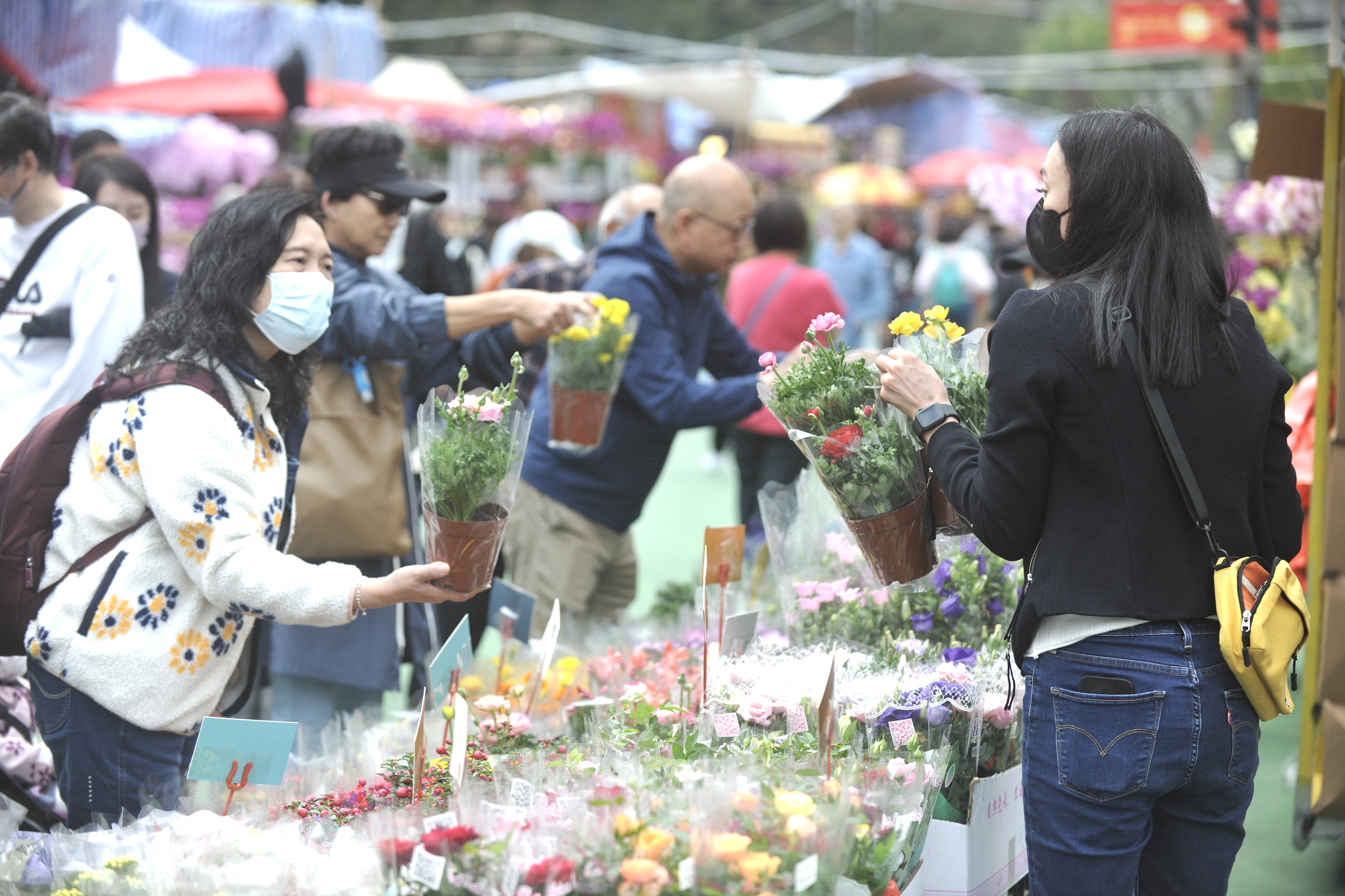 大公文匯全媒體記者所見,維園年宵市場人流如鯽,生意興旺,蘭花、銀柳、百合花、桃花等都是市民們的優選。市民趁立春好時節挑選心儀的新春花卉,面帶笑容,滿載而歸。