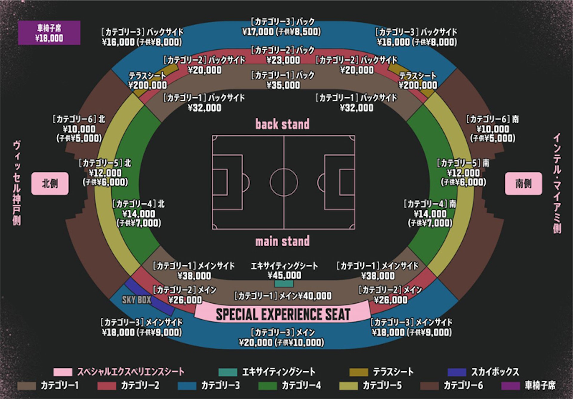 今次美斯、碧咸(又譯「貝克漢姆」)率國際邁阿密到訪日本,神戶勝利船也隆重其事,在比賽場地國立競技場劃出多種票價,若只計算純比賽門票,撇除廂房票,在正中央最前、球隊列隊時面對的看台門票價錢最高,達45000日圓(約2373港元),比香港站大球場三樓中間的票價(2980港元)更低,也不及香港站最貴門票(4880港元)的一半。
