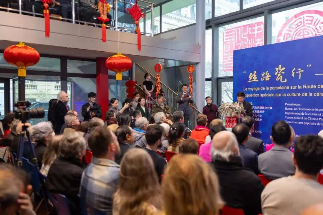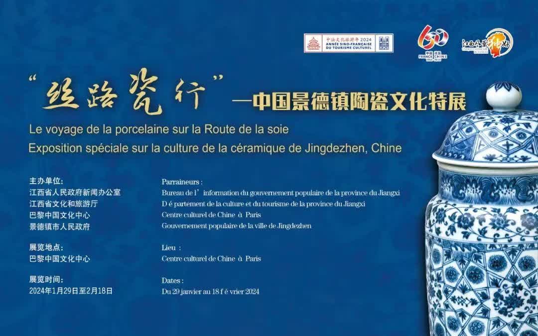 1月30日,由巴黎中國文化中心與江西省人民政府新聞辦公室、江西省文化和旅遊廳、景德鎮市人民政府共同主辦的「絲路瓷行」——中國景德鎮陶瓷文化特展在巴黎中國文化中心隆重開幕。中國駐法國大使館公使陳力、法國前總理讓-皮埃爾•拉法蘭(Jean-Pierre RAFFARIN)夫人安娜-瑪麗•拉法蘭(Anne-Marie RAFFARIN)、中國常駐聯合國教科文組織代表團副代表王盈、法國吉美國立亞洲藝術博物館館長雅尼克•琳茲(Yannick LINTZ)、巴黎中國文化中心主任劉紅革、江西省景德鎮市委宣傳部副部長董臻、法國巴黎7區副區長若西亞娜·高德(Josiane GAUDE)、法國文化部文化戲劇名譽總監讓-皮埃爾·餘爾斯(Jean-Pierre WURTZ)、前法國美術家協會主席「藝術家之家」主席雷米•艾融(Rémy ARON)和180多位法國文化、藝術和媒體界嘉賓出席了本次活動。
