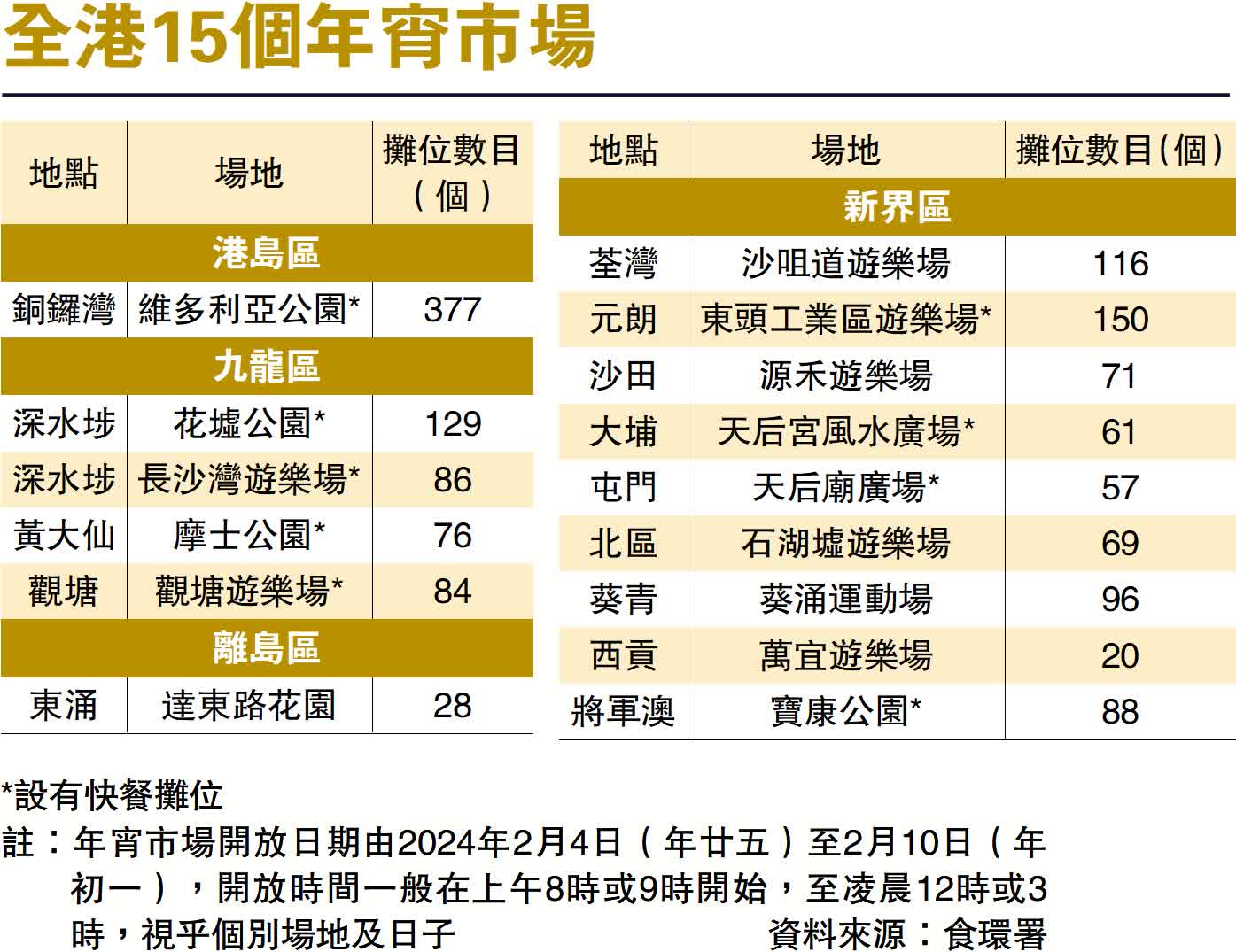 食環署15個年宵市場,除了維園年宵,新界區佔九個,分布沙田、元朗、大埔、荃灣、屯門等;九龍區佔四個,以位於花墟公園的年宵市場最大,共有129個攤位;離島區的東涌,也有一個位於達東路花園的小型年宵市場,場內設有28個攤位。開放時間方面,年廿八、廿九開放至凌晨,年三十晚通宵開放至年初一早上七時。