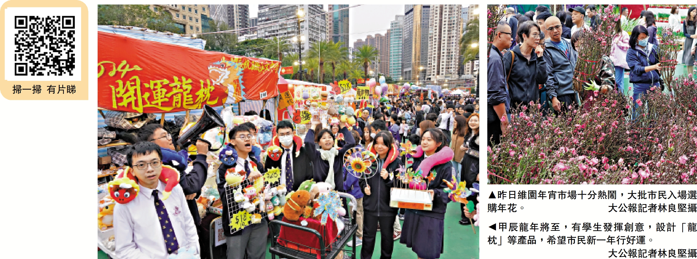 (大公報 記者 義昊、鍾佩欣、賴振雄)為期七日的年宵市場昨日開鑼,疫後首次重設乾貨檔及快餐攤檔。甲辰龍年將至,不少檔戶發揮創意,設計「龍」造型貨品售賣,包括以龍為主題的抱枕、頸枕及毛公仔,寓意「行運一條龍」,也有龍型風車應市,市民轉一轉,保證新一年順風順水。有年花攤檔表示,首日銷情不俗,預計生意較往年增長五成,也有花檔加推細盆年花「密食當三番」,百貨應百客。