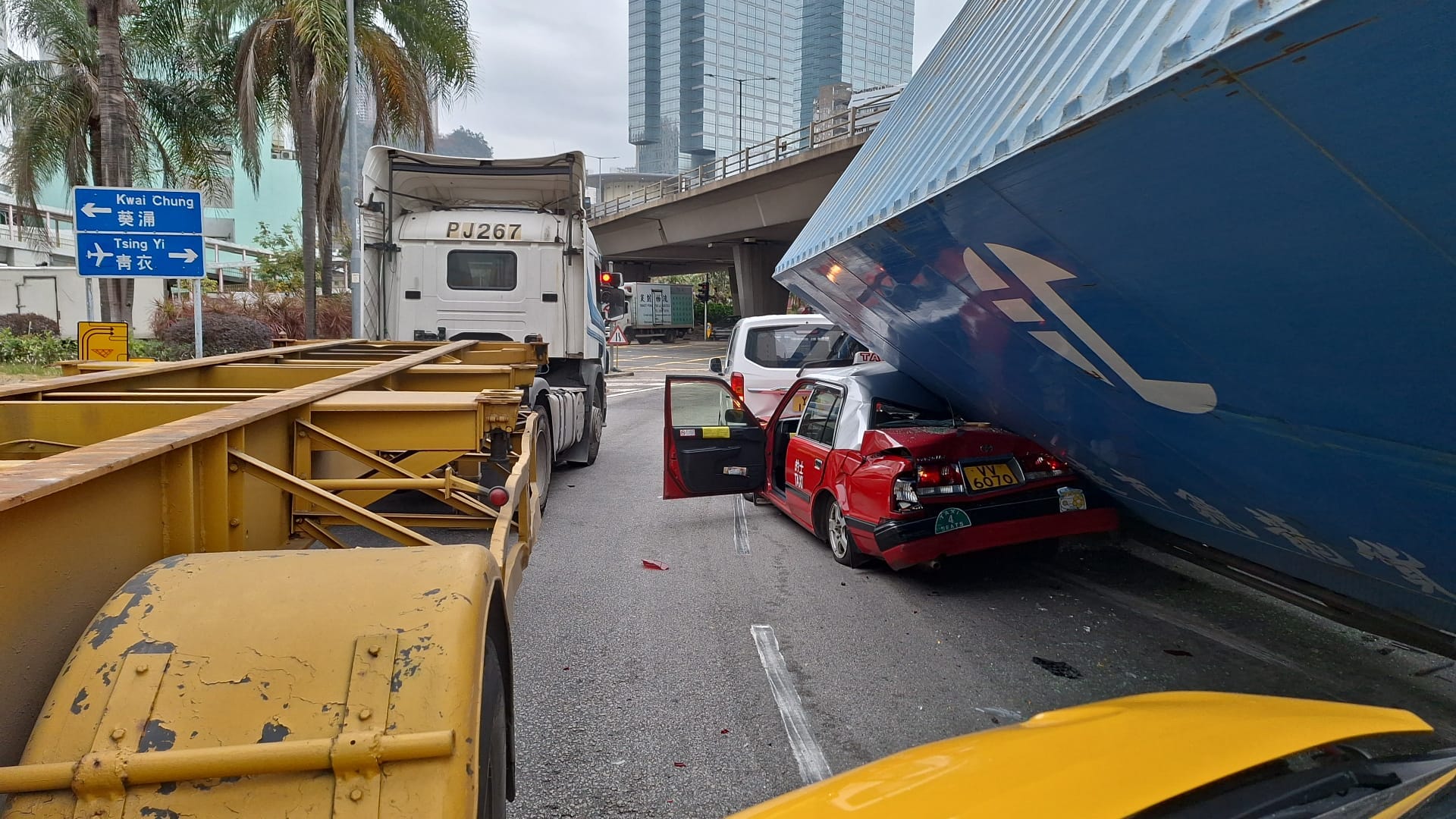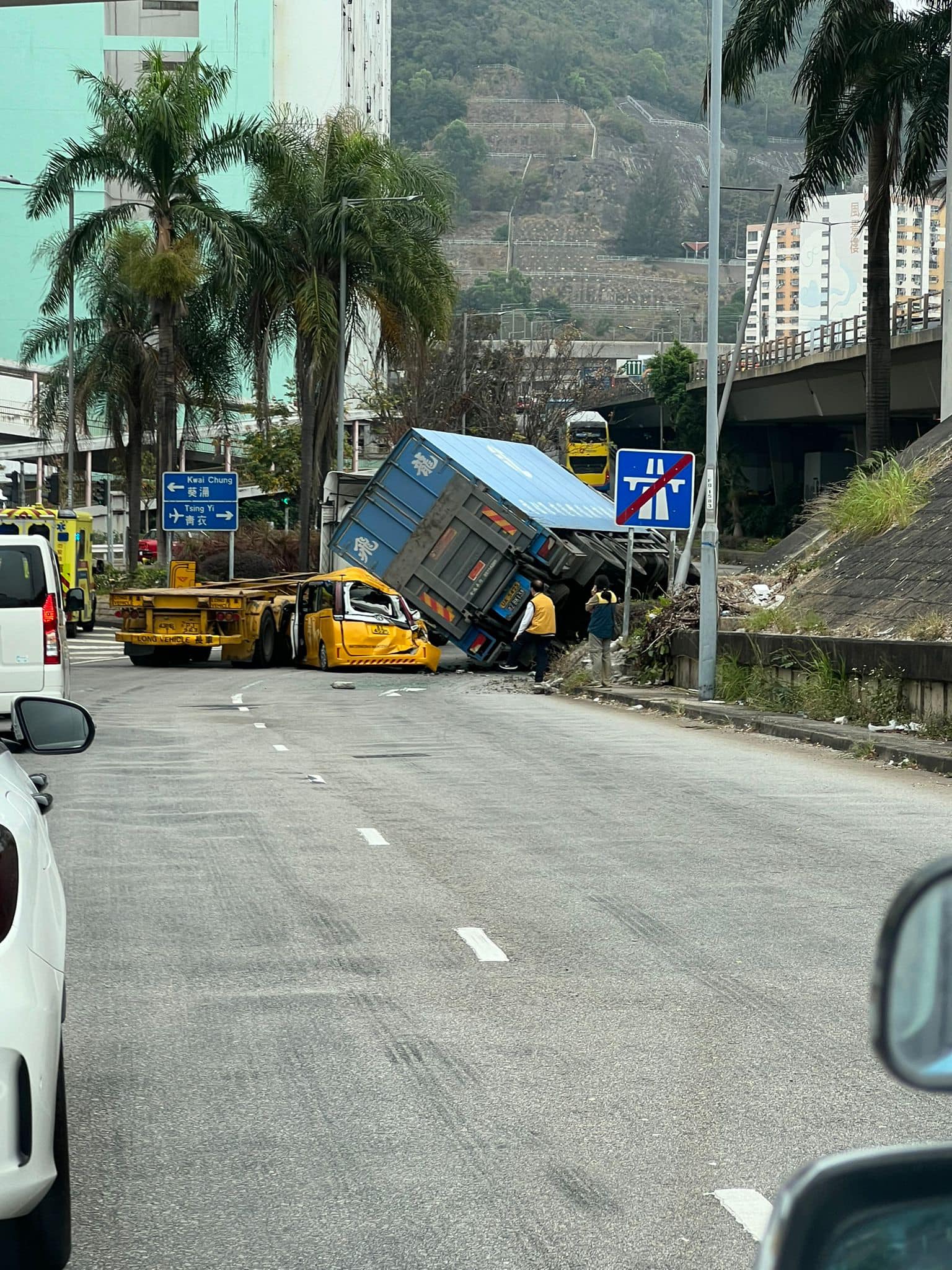 大公文匯全媒體報道,今日(5日)下午1時46分,警方接報荃灣路發生多車相撞,據報涉及5車,包括貨車、的士、拖頭等。據社交平台上載的現場照片,一輛貨車疑剷壆翻側,有的士、水務署車輛被壓至嚴重變形。